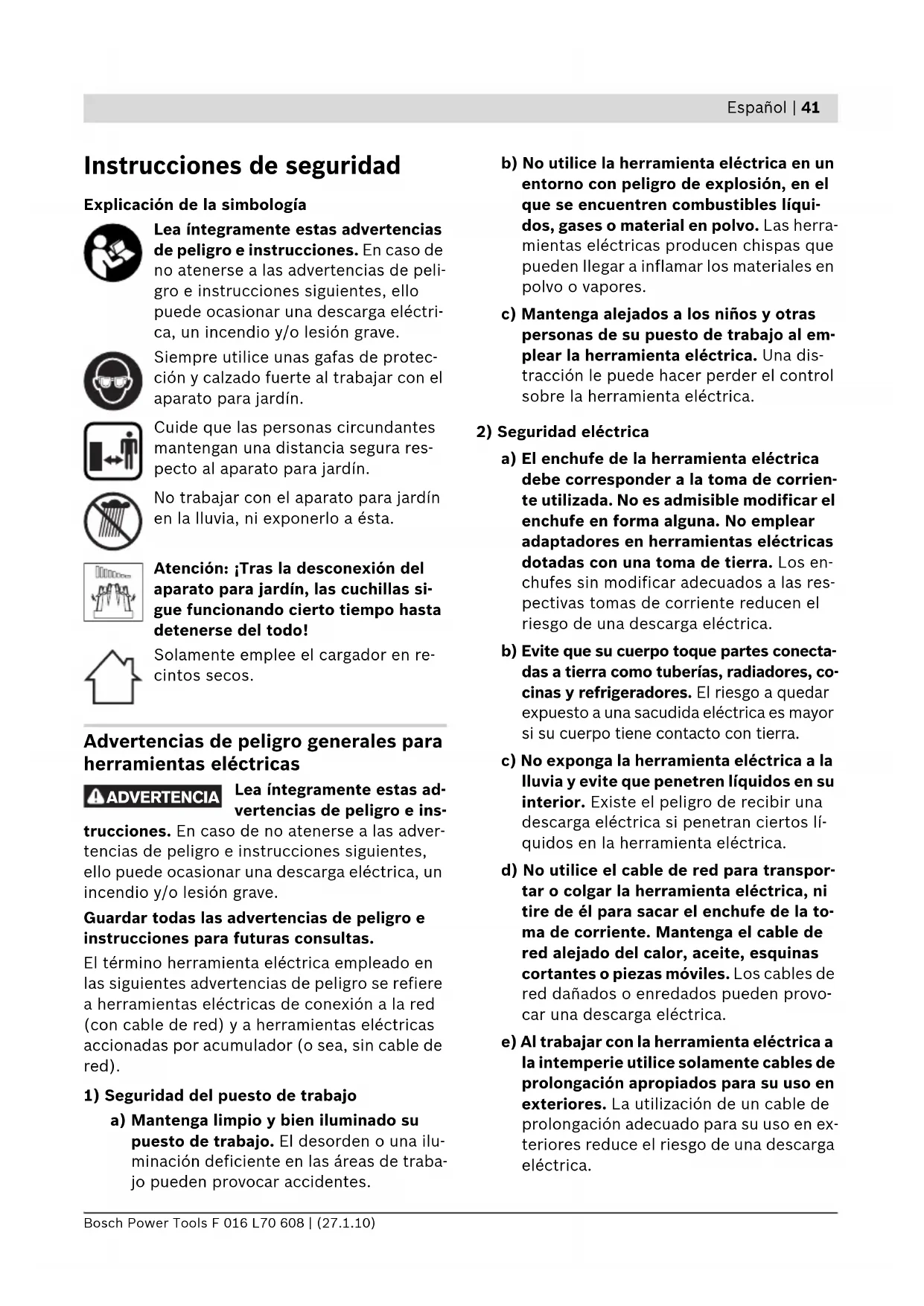 a) Únicamente haga reparar su herramienta eléctrica por un profesional, empleando exclusivamente piezas de repuesto origi- nales. Solamente así se mantiene la segu- ridad de la herramienta eléctrica. Instrucciones de seguridad para tijeras cortasetos f Mantenga alejadas todas las partes del cuerpo de las cuchillas. No intente retirar material cortado, ni sujetar el material a cortar mientras estén funcionando las cu- chillas. Únicamente retire el material atas- cado estando desconectado el aparato. Un momento de distracción durante el uso de la tijera cortasetos puede provocarle serias le- siones. f Transporte la tijera cortasetos sujetándola por la empuñadura y con la cuchilla deteni- da. Al transportar y guardar la tijera corta- setos montar siempre la funda protectora. El trato y uso cuidadoso del aparato reduce el riego de accidente con la cuchilla. f Solamente sujete la herramienta eléctrica por las empuñaduras aisladas, ya que es po- sible que las cuchillas lleguen a tocar cables eléctricos ocultos. El contacto de las cuchi- llas con conductores bajo tensión puede ha- cer que las partes metálicas de la herramien- ta eléctrica le provoquen una descarga eléctrica. f Mantenga el cable alejado del área de corte. Al trabajar puede ocurrir que el cable quede oculto en el arbusto y sea cortado por equi- vocación. Instrucciones de seguridad para tijeras para poda de arbustos/tijeras cortacés- ped f Este aparato para jardín no ha sido diseñado para ser utilizado por personas o niños que presenten una discapacidad física, sensorial o mental, o que dispongan de una experien- cia y/o conocimientos insuficientes, a no ser que sean supervisados por una persona en- cargada de velar por su seguridad o de ins- truirles en el manejo del aparato para jardín. Los niños deberán ser vigilados con el fin de evitar que jueguen con el aparato para jardín. OBJ_BUCH-1077-002.book Page 43 Wednesday, January 27, 2010 4:40 PM44 | Español F 016 L70 608 | (27.1.10) Bosch Power Tools f Jamás permita que usen el aparato para jar- dín niños, ni aquellas personas que no estén familiarizadas con estas instrucciones. Tenga en cuenta la edad mínima que pudiera pres- cribirse en su país para el usuario. Guarde el aparato para jardín fuera del alcance de los niños cuando no lo utilice. f El usuario es responsable de los accidentes o daños provocados a otras personas o a sus pertenencias. f Nunca ponga a funcionar el aparato para jar- dín si en las inmediaciones se encuentran personas, y muy en especial niños, así como animales domésticos. f Mantenga el cable de conexión alejado de las cuchillas. f Siempre utilice unas gafas de protección y calzado fuerte al trabajar con el aparato para jardín. f No realice trabajos de corte si las condicio- nes climáticas son adversas, especialmente si se avecinan tormentas. f Únicamente utilice el aparato para jardín con luz diurna o con buena iluminación artificial. f Verifique el correcto estado y montaje de las cubiertas y dispositivos protectores. Antes de su utilización efectúe los trabajos de man- tenimiento y reparación que pudieran estar pendientes. f Solamente conecte el aparato para jardín si las manos y pies están suficientemente aleja- dos de las cuchillas. f Siempre corte la alimentación del aparato para jardín (p. ej., extrayendo el enchufe de la red o accionando el bloqueo de conexión): – Siempre que se aparte del aparato para jardín. – Antes de eliminar una obstrucción de ma- terial. – Al examinar, limpiar o manipular en el apa- rato para jardín. – Tras chocar contra un cuerpo extraño. Examine de inmediato si está dañado el aparato para jardín y hágalo reparar, si procede. – Si el aparato para jardín comienza a vibrar de forma anormal (verificarlo de inmedia- to). f Preste atención a no lesionarse los pies y ma- nos con las cuchillas. f Bloquee el interruptor de conexión/desco- nexión en la posición de desconexión antes de manipular en la herramienta eléctrica (p.ej. en el mantenimiento, cambio de útil, etc.), así como al transportarla y guardarla. En caso contrario podría accidentarse al ac- cionar fortuitamente el interruptor de co- nexión/desconexión. Proteja la herramienta eléctrica del calor excesivo como, p.ej., de una ex- posición prolongada al sol y del fue- go. Existe el riesgo de explosión. f No intente abrir el acumulador. Podría pro- vocar un cortocircuito. f No cortocircuite el acumulador. Existe el riesgo de explosión. f Si el acumulador se daña o usa de forma in- apropiada puede que éste emane vapores. Ventile con aire fresco el recinto y acuda a un médico si nota alguna molestia. Los va- pores pueden llegar a irritar las vías respira- torias. f Un acumulador defectuoso puede perder lí- quido y humedecer la piezas adyacentes. Examine las piezas afectadas. Límpielas, o sustitúyalas si fuese necesario. Instrucciones de seguridad para carga- dores No exponga el cargador a la lluvia ni a la humedad. La penetración de agua en el cargador aumenta el riesgo de electrocución. f Solamente cargue los acumuladores con los cargadores recomendados por el fabrican- te. Existe el riesgo de incendio al intentar cargar acumuladores de un tipo diferente al previsto para el cargador. f No cargue acumuladores de otra marca. El cargador solamente es adecuado para cargar acumuladores Bosch de iones de Li de las tensiones indicadas en los datos técnicos. En caso de no atenerse a ello podría originarse un incendio o explosión. OBJ_BUCH-1077-002.book Page 44 Wednesday, January 27, 2010 4:40 PMEspañol | 45 Bosch Power Tools F 016 L70 608 | (27.1.10) f No intente cargar baterías que no sean re- cargables con este cargador. Existe el riesgo de explosión. f Siempre mantenga limpio el cargador. La suciedad puede comportar un riesgo de elec- trocución. f Inspeccione el cargador antes de cada uso. Si detecta algún daño, cambie el cargador por otro nuevo. No abra el cargador por su 