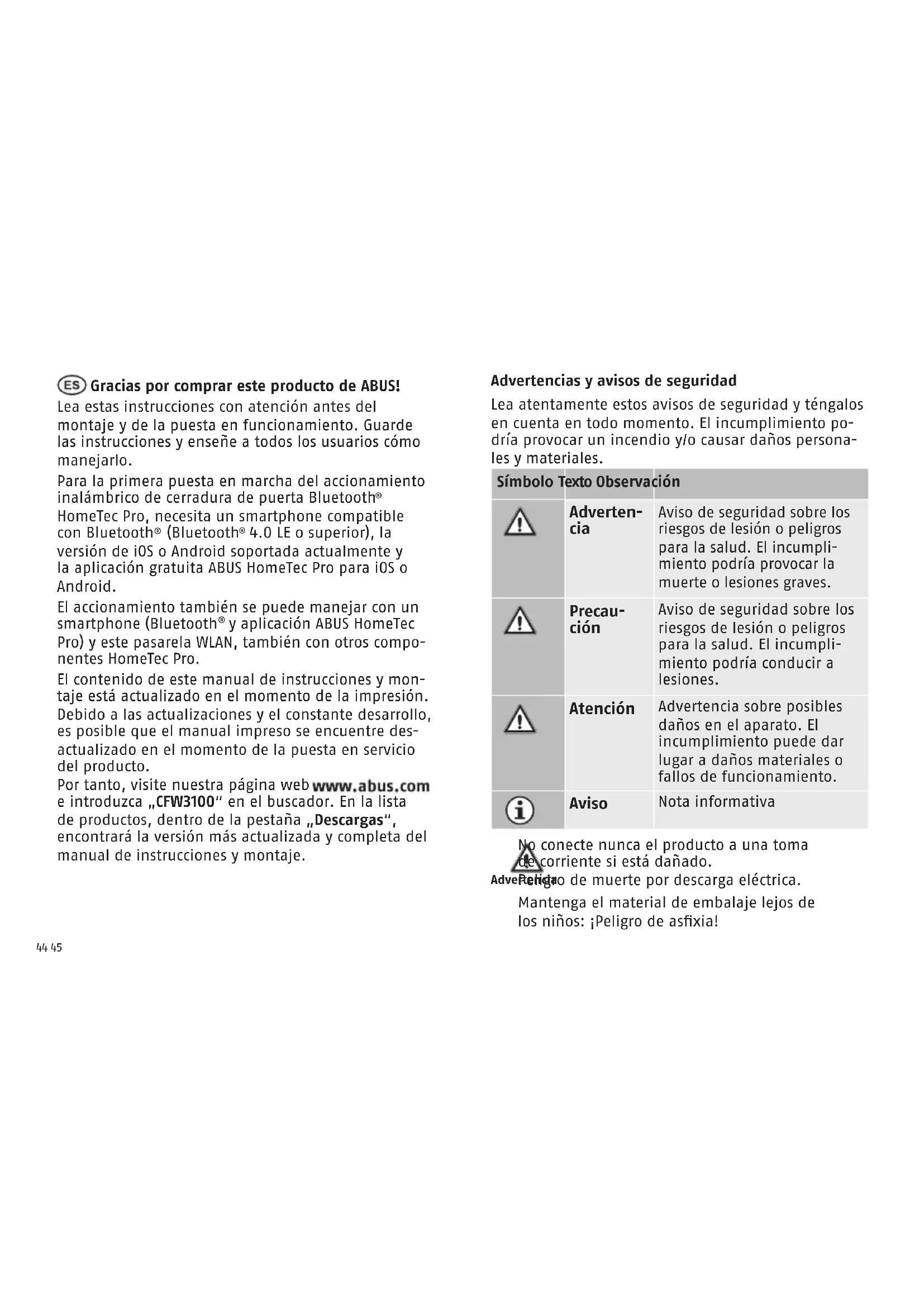 y aplicación ABUS HomeTec Pro) y este pasarela WLAN, también con otros compo- nentes HomeTec Pro. El contenido de este manual de instrucciones y mon- taje está actualizado en el momento de la impresión. Debido a las actualizaciones y el constante desarrollo, es posible que el manual impreso se encuentre des- actualizado en el momento de la puesta en servicio del producto. Por tanto, visite nuestra página web e introduzca „CFW3100“ en el buscador. En la lista de productos, dentro de la pestaña „Descargas“, encontrará la versión más actualizada y completa del manual de instrucciones y montaje. Advertencias y avisos de seguridad Lea atentamente estos avisos de seguridad y téngalos en cuenta en todo momento. El incumplimiento po- dría provocar un incendio y/o causar daños persona- les y materiales. Símbolo Texto Observación Adverten- cia Aviso de seguridad sobre los riesgos de lesión o peligros para la salud. El incumpli- miento podría provocar la muerte o lesiones graves. Precau- ción Aviso de seguridad sobre los riesgos de lesión o peligros para la salud. El incumpli- miento podría conducir a lesiones. Atención Advertencia sobre posibles daños en el aparato. El incumplimiento puede dar lugar a daños materiales o fallos de funcionamiento. Aviso Nota informativa Advertencia No conecte nunca el producto a una toma de corriente si está dañado. Peligro de muerte por descarga eléctrica. Mantenga el material de embalaje lejos de los niños: ¡Peligro de asxia!46 47 Atención