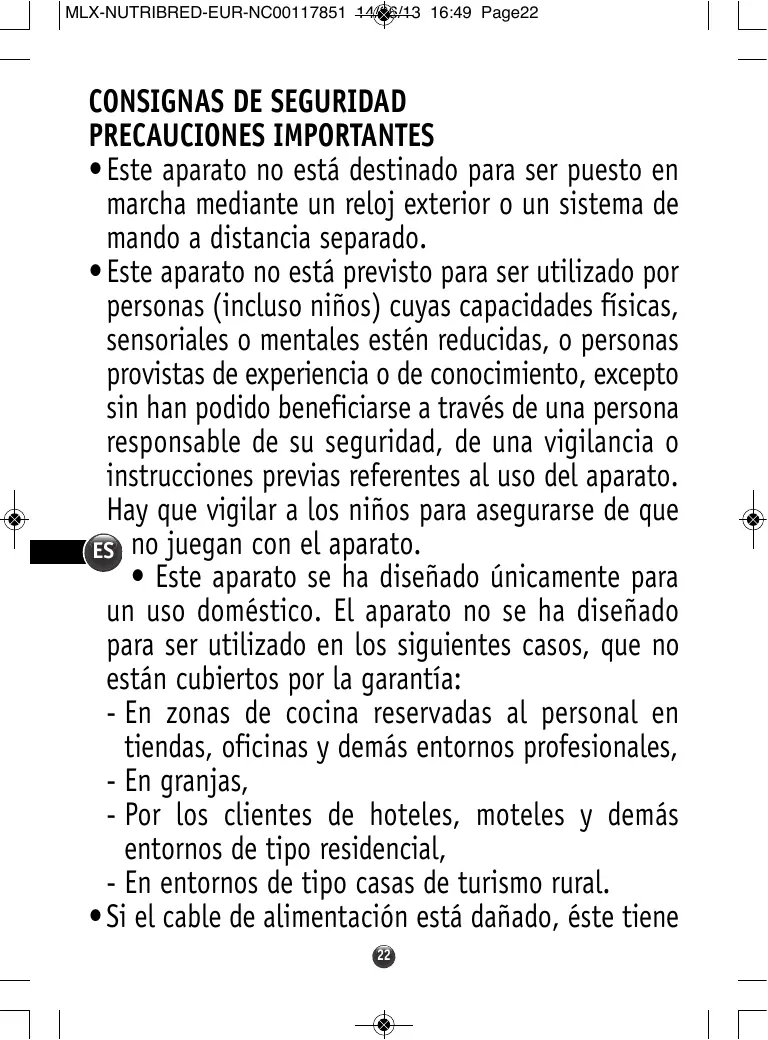 - Por los clientes de hoteles, moteles y demás entornos de tipo residencial, - En entornos de tipo casas de turismo rural. • Si el cable de alimentación está dañado, éste tiene 22