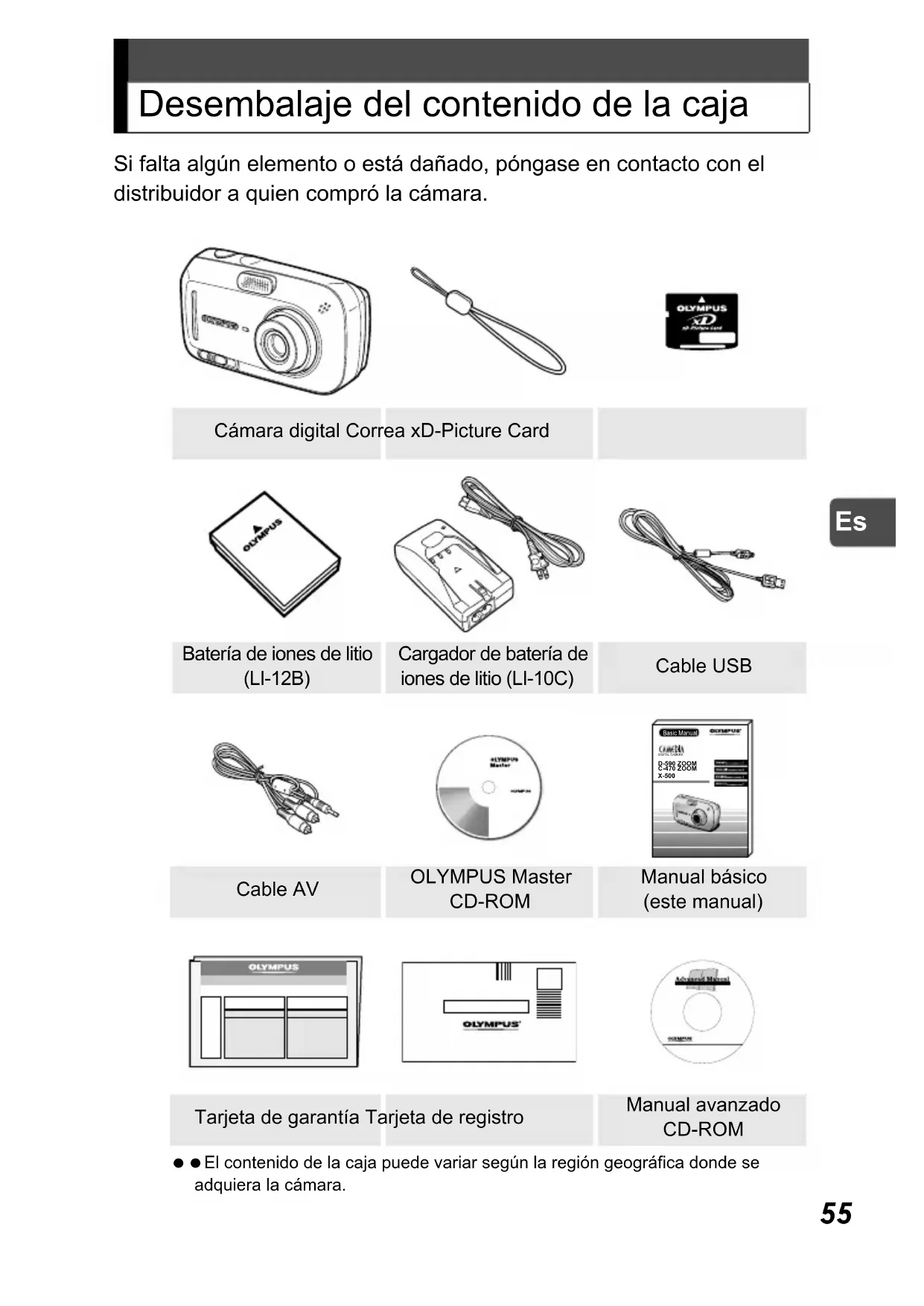 Desembalaje del contenido de la caja Si falta algún elemento o está dañado, póngase en contacto con el distribuidor a quien compró la cámara. El contenido de la caja puede variar según la región geográfica donde se adquiera la cámara. Cámara digital Correa xD-Picture Card Batería de iones de litio (LI-12B) Cargador de batería de iones de litio (LI-10C) Cable USB Cable AV OLYMPUS Master CD-ROM Manual básico (este manual) Tarjeta de garantía Tarjeta de registro Manual avanzado CD-ROM D-590 ZOOMC-470 ZOOMX-500Basic ManualDIGITAL CAMERA 000e_kihonhen.book Page 55 Tuesday, August 24, 2004 1:49 PM56