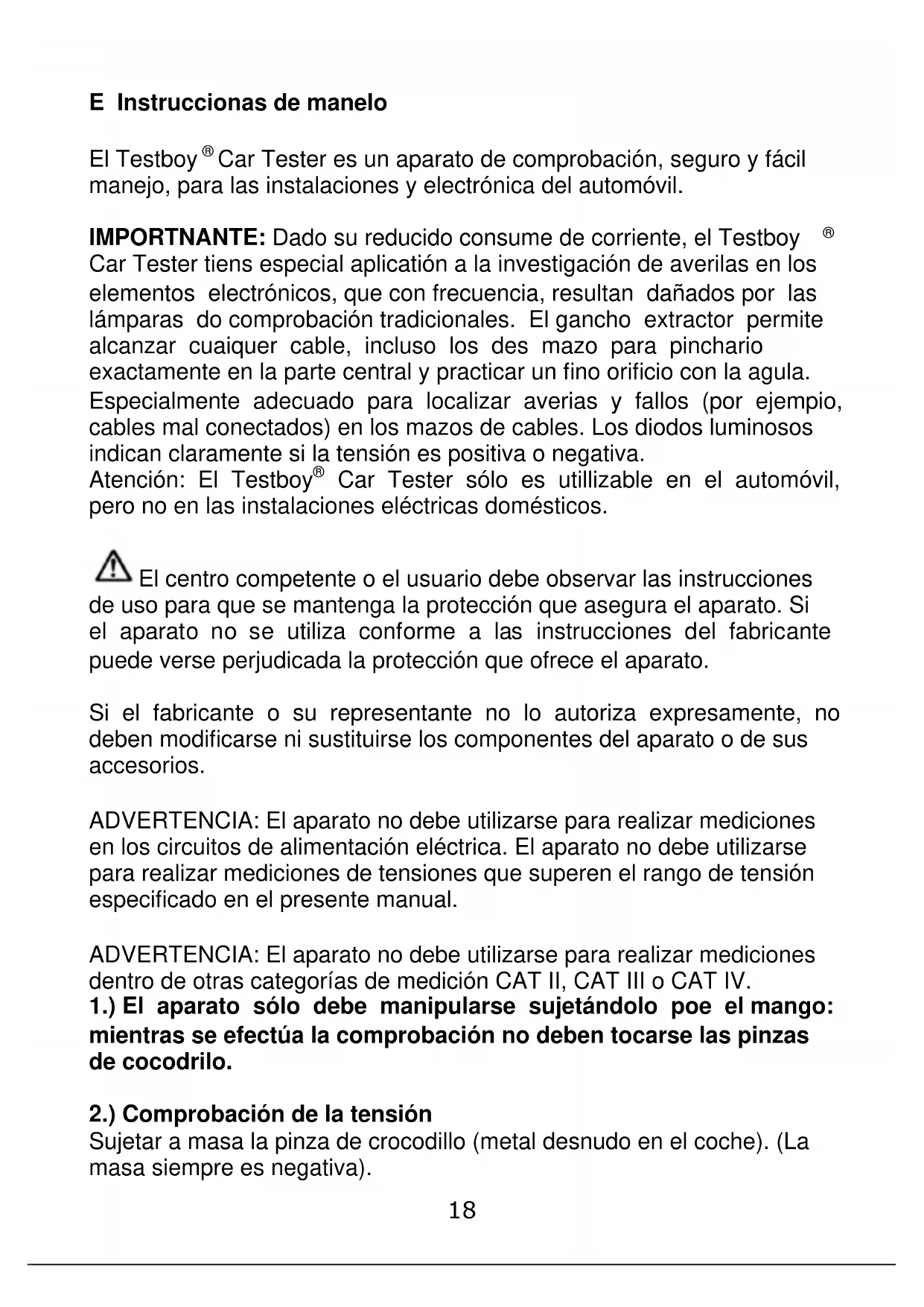 Car Tester sólo es utillizable en el automóvil, pero no en las instalaciones eléctricas domésticos. El centro competente o el usuario debe observar las instrucciones de uso para que se mantenga la protección que asegura el aparato. Si el aparato no se utiliza conforme a las instrucciones del fabricante puede verse perjudicada la protección que ofrece el aparato. Si el fabricante o su representante no lo autoriza expresamente, no deben modificarse ni sustituirse los componentes del aparato o de sus accesorios. ADVERTENCIA: El aparato no debe utilizarse para realizar mediciones en los circuitos de alimentación eléctrica. El aparato no debe utilizarse para realizar mediciones de tensiones que superen el rango de tensión especificado en el presente manual. ADVERTENCIA: El aparato no debe utilizarse para realizar mediciones dentro de otras categorías de medición CAT II, CAT III o CAT IV. 1.) El aparato sólo debe manipularse sujetándolo poe el mango: mientras se efectúa la comprobación no deben tocarse las pinzas de cocodrilo. 2.) Comprobación de la tensión Sujetar a masa la pinza de crocodillo (metal desnudo en el coche). (La masa siempre es negativa).19 Aplicar la punta de comprobación del Testboy
