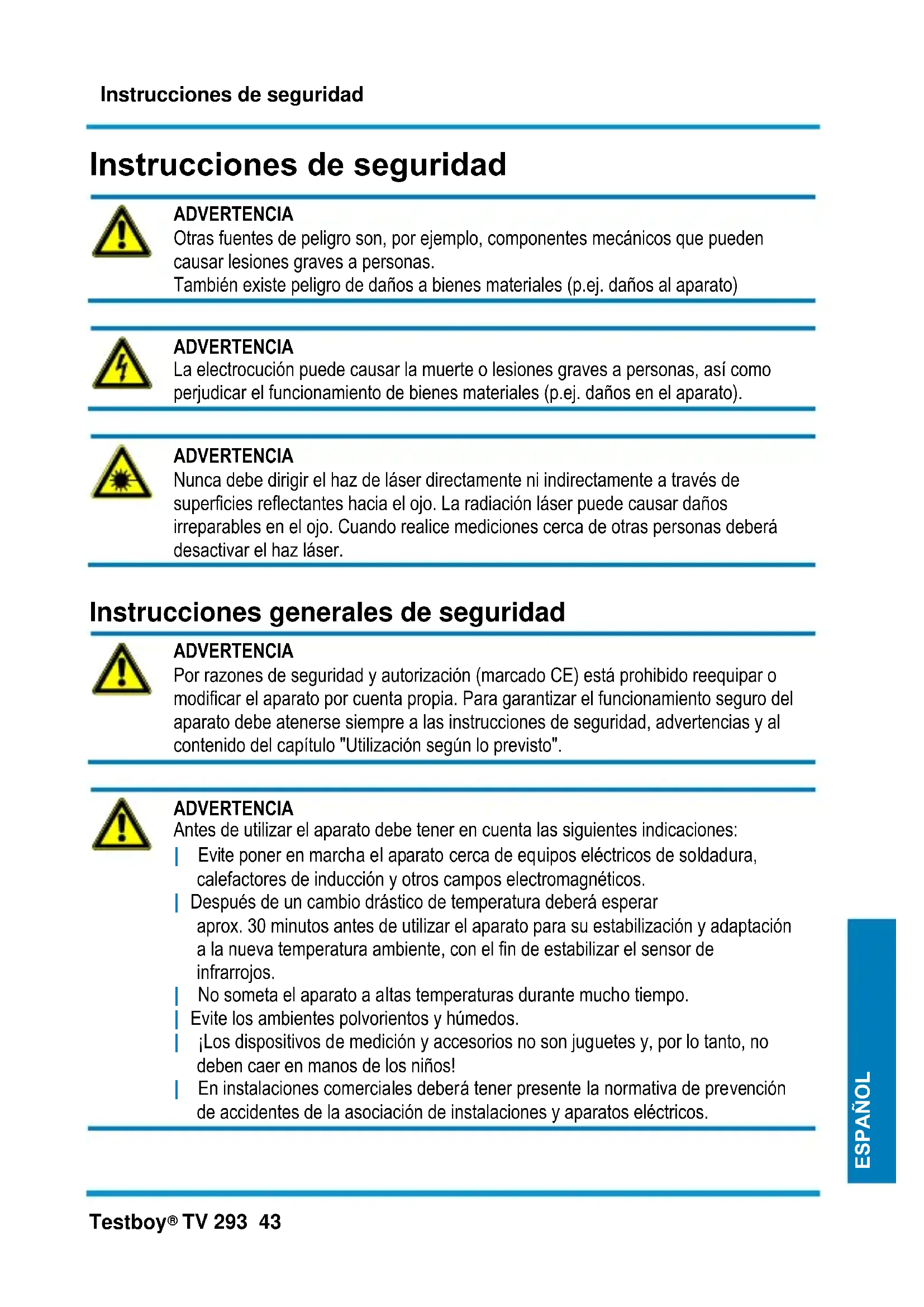 ADVERTENCIA Antes de utilizar el aparato debe tener en cuenta las siguientes indicaciones: | Evite poner en marcha el aparato cerca de equipos eléctricos de soldadura, calefactores de inducción y otros campos electromagnéticos. | Después de un cambio drástico de temperatura deberá esperar aprox. 30 minutos antes de utilizar el aparato para su estabilización y adaptación a la nueva temperatura ambiente, con el fin de estabilizar el sensor de infrarrojos. | No someta el aparato a altas temperaturas durante mucho tiempo. | Evite los ambientes polvorientos y húmedos. | ¡Los dispositivos de medición y accesorios no son juguetes y, por lo tanto, no deben caer en manos de los niños! | En instalaciones comerciales deberá tener presente la normativa de prevención de accidentes de la asociación de instalaciones y aparatos eléctricos.Instrucciones de seguridad 44 Testboy