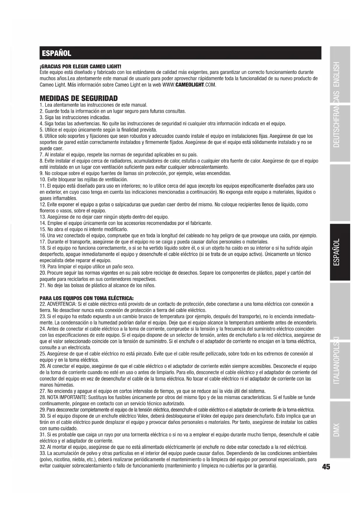 28. NOTA IMPORTANTE: Sustituya los fusibles únicamente por otros del mismo tipo y de las mismas características. Si el fusible se funde continuamente, póngase en contacto con un servicio técnico autorizado. 29. Para desconectar completamente el equipo de la tensión eléctrica, desenchufe el cable eléctrico o el adaptador de corriente de la toma eléctrica. 30. Si el equipo dispone de un enchufe eléctrico Volex, deberá desbloquearse el Volex del equipo para desenchufarlo. Esto implica que un tirón en el cable eléctrico puede desplazar el equipo y provocar daños personales o materiales. Por tanto, asegúrese de instalar los cables con sumo cuidado. 31. Si es probable que caiga un rayo por una tormenta eléctrica o si no va a emplear el equipo durante mucho tiempo, desenchufe el cable eléctrico y el adaptador de corriente. 32. Al montar el equipo, asegúrese de que no está alimentado eléctricamente (el enchufe no debe estar conectado a la red eléctrica). 33. La acumulación de polvo y otras partículas en el interior del equipo puede causar daños. Dependiendo de las condiciones ambientales (polvo, nicotina, niebla, etc.), deberá realizarse periódicamente el mantenimiento o la limpieza del equipo por personal especializado, para evitar cualquier sobrecalentamiento o fallo de funcionamiento (mantenimiento y limpieza no cubiertos por la garantía).46 DMX ITALIANO POLSKI ESPAÑOL FRANCAIS DEUTSCHENGLISH