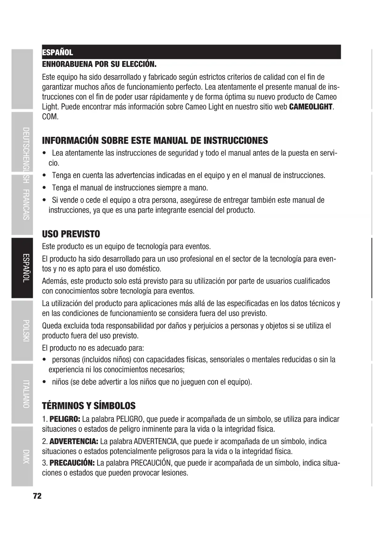 DMX ITALIANO POLSKI ESPAÑOL FRANCAIS DEUTSCHENGLISH ESPAÑOL ENHORABUENA POR SU ELECCIÓN. Este equipo ha sido desarrollado y fabricado según estrictos criterios de calidad con el fin de garantizar muchos años de funcionamiento perfecto. Lea atentamente el presente manual de ins- trucciones con el fin de poder usar rápidamente y de forma óptima su nuevo producto de Cameo Light. Puede encontrar más información sobre Cameo Light en nuestro sitio web CAMEOLIGHT. COM. INFORMACIÓN SOBRE ESTE MANUAL DE INSTRUCCIONES