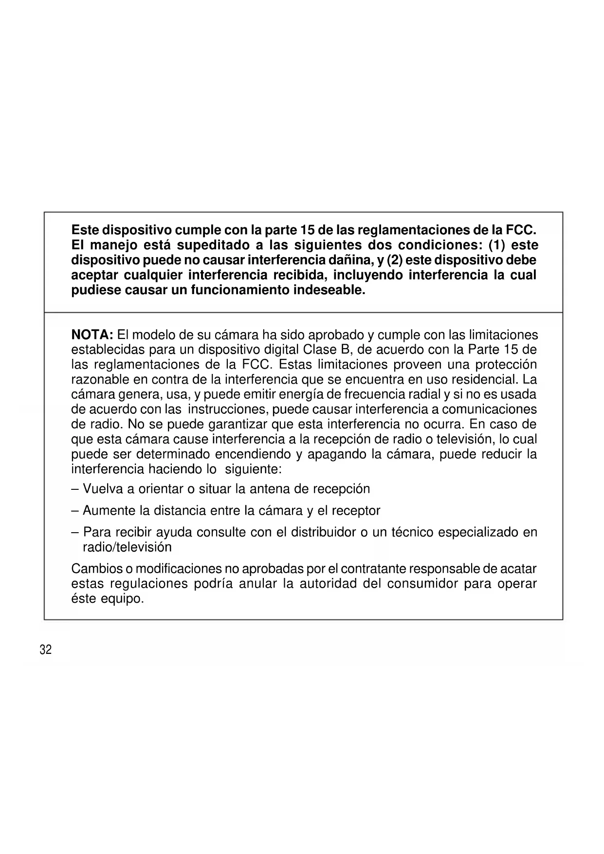 - Proteja la cámara del polvo, humedad, golpe repentino, y calor excesivo. Precaución: No use solventes o soluciones ásperas o abrasivas en el cuerpo de la cámara.