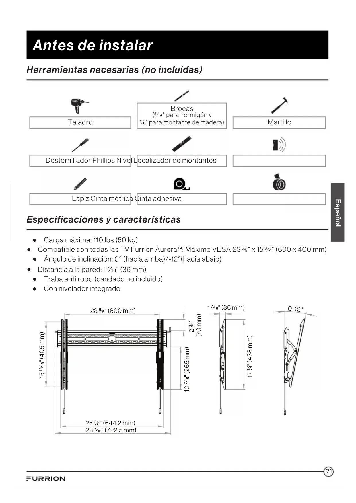 vous pouvez verrouiller l'ensemble de fixation à l'aide d'un verrou (non inclus). Verrou (diamètre du trou de verrouillage ≤3,5mm) Pour régler l'angle d'inclinaison, il suffit de déplacer le téléviseur à l'angle souhaité. Si vous ne pouvez pas facilement déplacer le téléviseur pour changer l'angle d'inclinaison, desserrez ou serrez les vis de réglage sur les bras de gauche/droite afin de régler le téléviseur à l'angle souhaité. Remarque: Une fois le réglage terminé, serrez fermement les vis de gauche et de droite afin d'éviter tous dommages occasionnés par tout mouvement.19 Bienvenido Español Gracias por comprar el soporte universal de inclinación fija para exteriores Furrion para televisores Furrion Aurora™ de 43" / 49" / 55" / 65". Antes de usar su nuevo producto, lea atentamente estas instrucciones. Este manual de instrucciones contiene información relativa a la instalación y el uso seguro del producto. Por favor, guarde este manual para su referencia futura. El fabricante no acepta responsabilidad por daños provocados por una instalación incorrecta a causa de no seguir estas instrucciones. Si tiene más preguntas sobre nuestros productos, contáctenos en support@furrion.com Instrucción de seguridad importante ADVERTENCIA Este producto está diseñado para instalarse en paredes con montantes de madera o de hormigón macizo. Antes de instalar, asegúrese de que la pared o la superficie de montaje podrán soportar de forma segura cuatro veces el peso combinado de los equipos montados, incluyendo sus accesorios. Nunca exceda la capacidad de carga máxima (110lbs/50kg). TENGA EN CUENTA: Una instalación incorrecta anulará la garantía y podría causar lesiones o daños graves. Se recomienda contratar un experto para que instale el soporte de inclinaciónfija. Precaución de seguridad