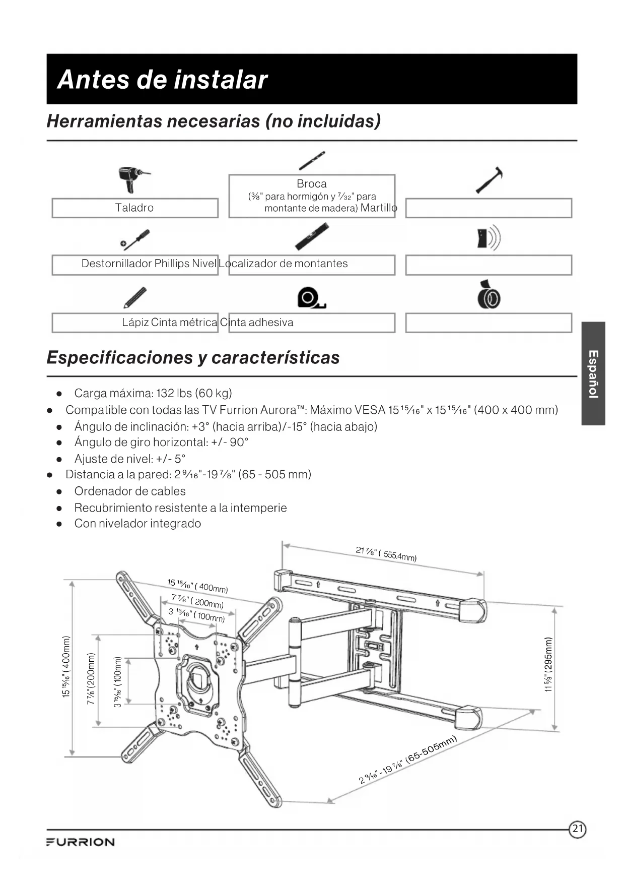 Vous pouvez desserrer légèrement les deux vis de tension d'inclinaison à l'aide de la clé hexagonale (M) afin de régler l'angle d'inclinaison pour une position de visionnage optimale. Une fois le réglage terminé, serrez fermement les deux vis à l'aide de la clé hexagonale (M). +3 / -15 Passe-câbles L’attache passe-câbles est fournie pour être ajoutée sur le bras de fixation afin de maintenir vos câbles organisés et protégés.19 Bienvenido Español Gracias por comprar el soporte universal de movimiento completo para exteriores Furrion para televisores Furrion Aurora™ de 43” / 49”/ 55” / 65”. Antes de usar su nuevo producto, lea atentamente estas instrucciones. Este manual de instrucciones contiene información relativa a la instalación y el uso seguro del producto. Por favor, guarde este manual para su referencia futura. El fabricante no acepta responsabilidad por daños provocados por una instalación incorrecta a causa de no seguir estas instrucciones. Si tiene más preguntas sobre nuestros productos, contáctenos en support@furrion.com Instrucción de seguridad importante ADVERTENCIA Este producto está diseñado para instalarse en paredes con montantes de madera o de hormigón macizo. Antes de instalar, asegúrese de que la pared o la superficie de montaje podrán soportar de forma segura cuatro veces el peso combinado de los equipos montados, incluyendo sus accesorios. Nunca exceda la Capacidad de carga máxima (132lbs/60kg). TENGA EN CUENTA: Una instalación incorrecta anulará la garantía y podría causar lesiones o daños graves. Se recomienda contratar un experto para que instale el soporte de movimiento completo. Precaución de seguridad