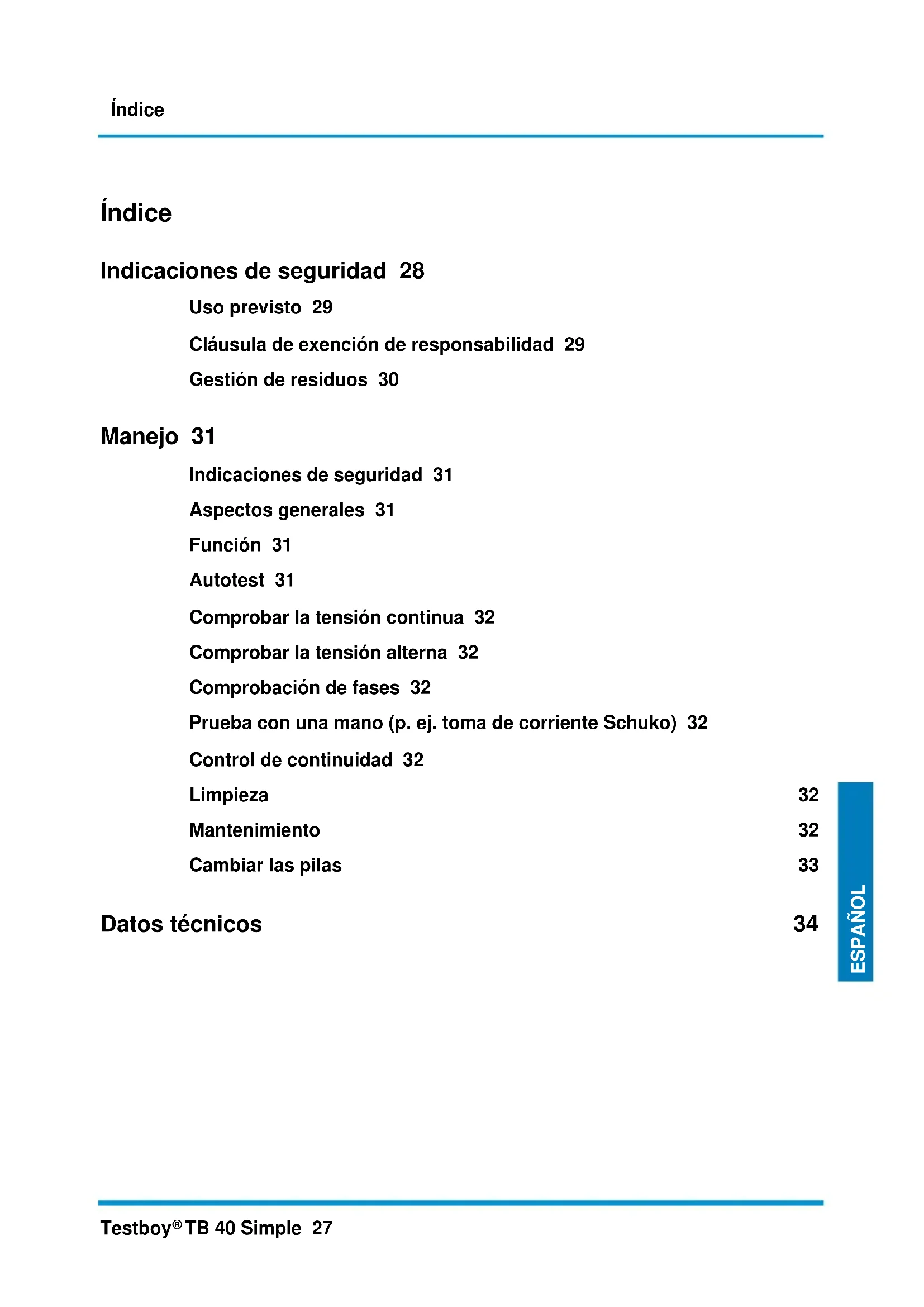TB 40 Simple 27 ENGLISH ESPAÑOL Índice Indicaciones de seguridad 28 Uso previsto 29 Cláusula de exención de responsabilidad 29 Gestión de residuos 30 Manejo 31 Indicaciones de seguridad 31 Aspectos generales 31 Función 31 Autotest 31 Comprobar la tensión continua 32 Comprobar la tensión alterna 32 Comprobación de fases 32 Prueba con una mano (p. ej. toma de corriente Schuko) 32 Control de continuidad 32 Limpieza 32 Mantenimiento 32 Cambiar las pilas 33 Datos técnicos 34Indicaciones de seguridad 28 Testboy