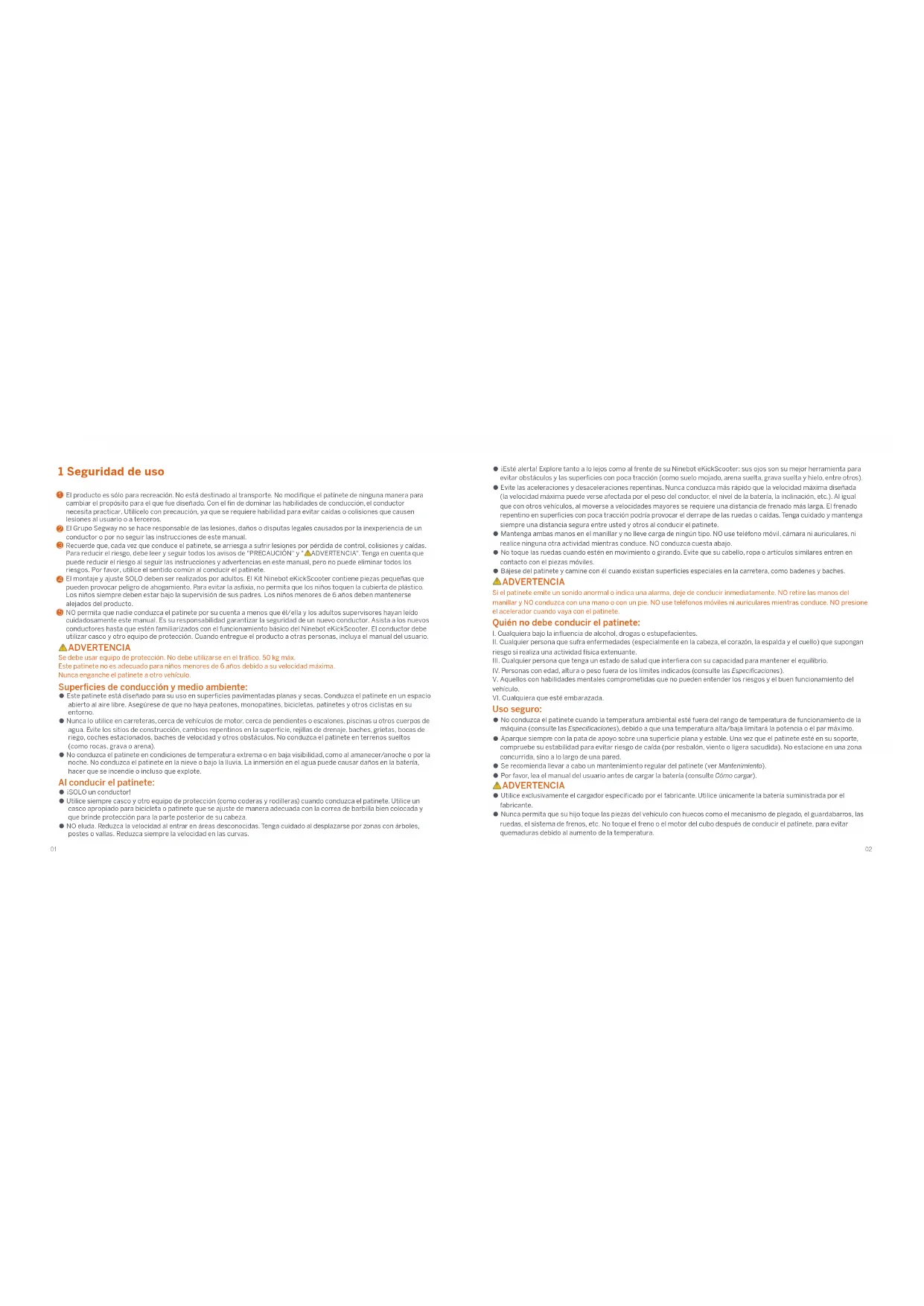 Uso seguro: ● No conduzca el patinete cuando la temperatura ambiental esté fuera del rango de temperatura de funcionamiento de la máquina (consulte las Especificaciones), debido a que una temperatura alta/baja limitará la potencia o el par máximo. ● Aparque siempre con la pata de apoyo sobre una superficie plana y estable. Una vez que el patinete esté en su soporte, compruebe su estabilidad para evitar riesgo de caída (por resbalón, viento o ligera sacudida). No estacione en una zona concurrida, sino a lo largo de una pared. ● Se recomienda llevar a cabo un mantenimiento regular del patinete (ver Mantenimiento). ● Por favor, lea el manual del usuario antes de cargar la batería (consulte Cómo cargar). ADVERTENCIA ● Utilice exclusivamente el cargador especificado por el fabricante. Utilice únicamente la batería suministrada por el fabricante. ● Nunca permita que su hijo toque las piezas del vehículo con huecos como el mecanismo de plegado, el guardabarros, las ruedas, el sistema de frenos, etc. No toque el freno o el motor del cubo después de conducir el patinete, para evitar quemaduras debido al aumento de la temperatura. 1 Seguridad de uso El producto es sólo para recreación. No está destinado al transporte. No modifique el patinete de ninguna manera para cambiar el propósito para el que fue diseñado. Con el fin de dominar las habilidades de conducción, el conductor necesita practicar. Utilícelo con precaución, ya que se requiere habilidad para evitar caídas o colisiones que causen lesiones al usuario o a terceros. El Grupo Segway no se hace responsable de las lesiones, daños o disputas legales causados por la inexperiencia de un conductor o por no seguir las instrucciones de este manual. Recuerde que, cada vez que conduce el patinete, se arriesga a sufrir lesiones por pérdida de control, colisiones y caídas. Para reducir el riesgo, debe leer y seguir todos los avisos de "PRECAUCIÓN" y " ADVERTENCIA". Tenga en cuenta que puede reducir el riesgo al seguir las instrucciones y advertencias en este manual, pero no puede eliminar todos los riesgos. Por favor, utilice el sentido común al conducir el patinete. El montaje y ajuste SOLO deben ser realizados por adultos. El Kit Ninebot eKickScooter contiene piezas pequeñas que pueden provocar peligro de ahogamiento. Para evitar la asfixia, no permita que los niños toquen la cubierta de plástico. Los niños siempre deben estar bajo la supervisión de sus padres. Los niños menores de 6 años deben mantenerse alejados del producto. NO permita que nadie conduzca el patinete por su cuenta a menos que él/ella y los adultos supervisores hayan leído cuidadosamente este manual. Es su responsabilidad garantizar la seguridad de un nuevo conductor. Asista a los nuevos conductores hasta que estén familiarizados con el funcionamiento básico del Ninebot eKickScooter. El conductor debe utilizar casco y otro equipo de protección. Cuando entregue el producto a otras personas, incluya el manual del usuario. ADVERTENCIA Se debe usar equipo de protección. No debe utilizarse en el tráfico. 50 kg máx. Este patinete no es adecuado para niños menores de 6 años debido a su velocidad máxima. Nunca enganche el patinete a otro vehículo. Superficies de conducción y medio ambiente: ● Este patinete está diseñado para su uso en superficies pavimentadas planas y secas. Conduzca el patinete en un espacio abierto al aire libre. Asegúrese de que no haya peatones, monopatines, bicicletas, patinetes y otros ciclistas en su entorno. ● Nunca lo utilice en carreteras, cerca de vehículos de motor, cerca de pendientes o escalones, piscinas u otros cuerpos de agua. Evite los sitios de construcción, cambios repentinos en la superficie, rejillas de drenaje, baches, grietas, bocas de riego, coches estacionados, baches de velocidad y otros obstáculos. No conduzca el patinete en terrenos sueltos (como rocas, grava o arena). ● No conduzca el patinete en condiciones de temperatura extrema o en baja visibilidad, como al amanecer/anoche o por la noche. No conduzca el patinete en la nieve o bajo la lluvia. La inmersión en el agua puede causar daños en la batería, hacer que se incendie o incluso que explote. Al conducir el patinete: ● ¡SOLO un conductor! ● Utilice siempre casco y otro equipo de protección (como coderas y rodilleras) cuando conduzca el patinete. Utilice un casco apropiado para bicicleta o patinete que se ajuste de manera adecuada con la correa de barbilla bien colocada y que brinde protección para la parte posterior de su cabeza. ● NO eluda. Reduzca la velocidad al entrar en áreas desconocidas. Tenga cuidado al desplazarse por zonas con árboles, postes o vallas. Reduzca siempre la velocidad en las curvas.