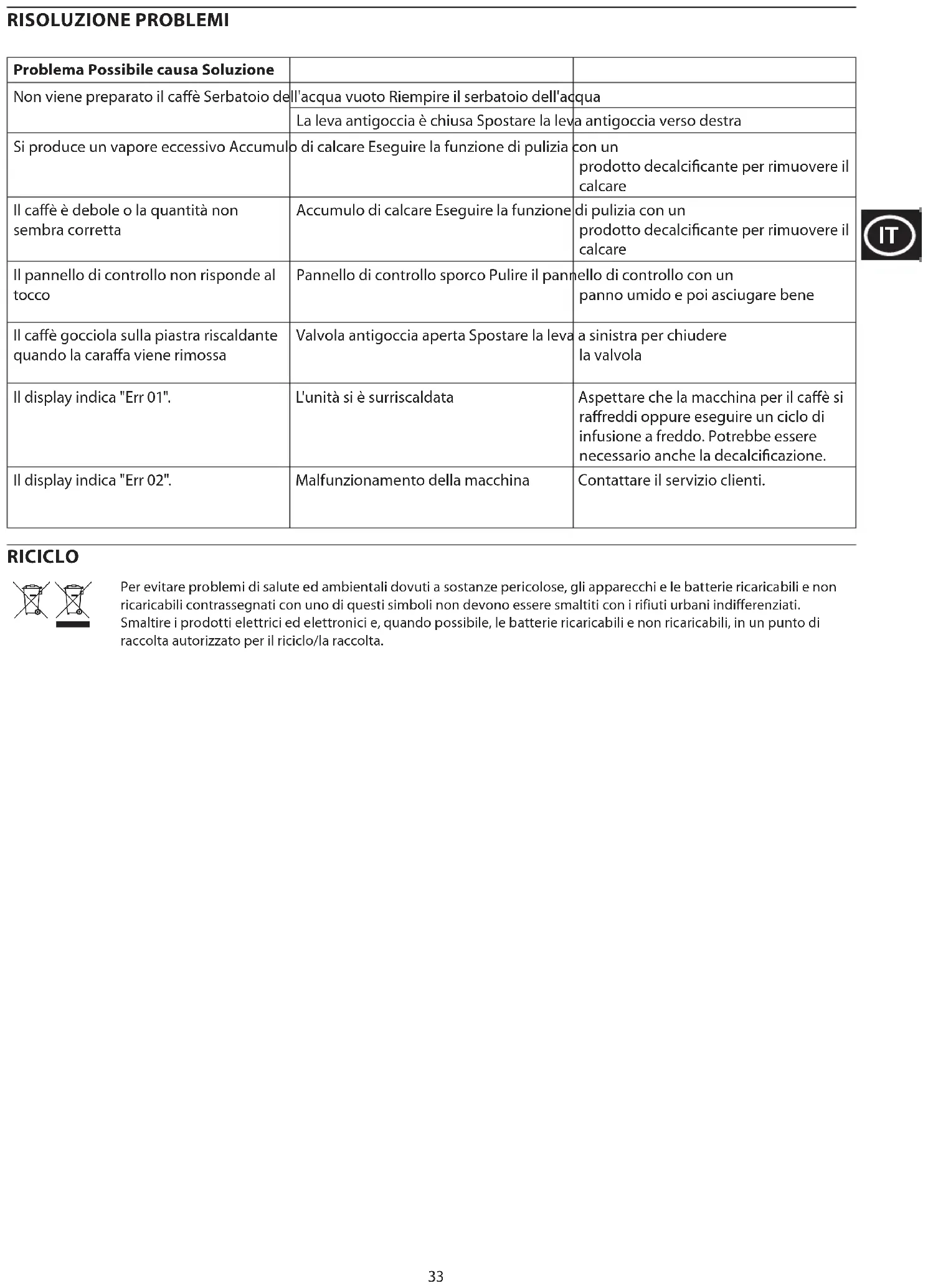 Problema Posible causa Solución El panel de control no responde al tacto Panel de control sucio Limpie el panel de control con un paño húmedo y séquelo bien El café gotea sobre la placa calefactora al retirar la jarra Válvula antigoteo abierta Mueva la palanca hacia la izquierda para cerrar la válvula La pantalla muestra “Err 01”. El aparato se ha sobrecalentado Puede esperar a que la cafetera se enfríe o puede realizar un ciclo de café en frío. También puede ser necesario descalcificar. La pantalla muestra “Err 02”. El aparato se ha averiado Póngase en contacto con el servicio de atención al cliente. RECICLAJE