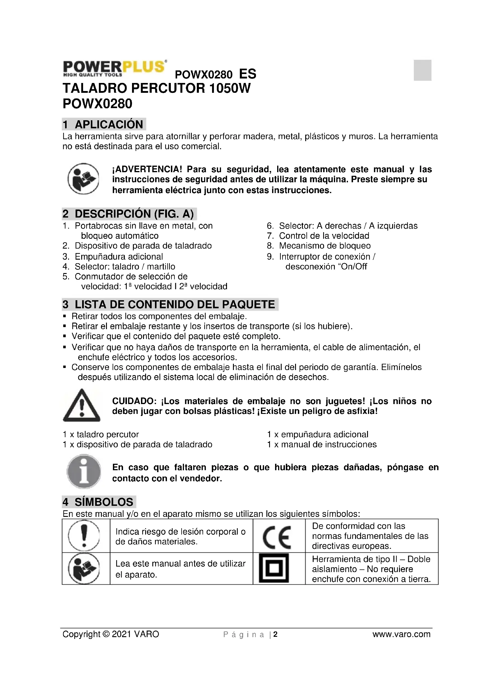 Herramienta de tipo II – Doble aislamiento – No requiere enchufe con conexión a tierra.POWX0280 ES Copyright © 2021 VARO P á g i n a | 3 www.varo.com