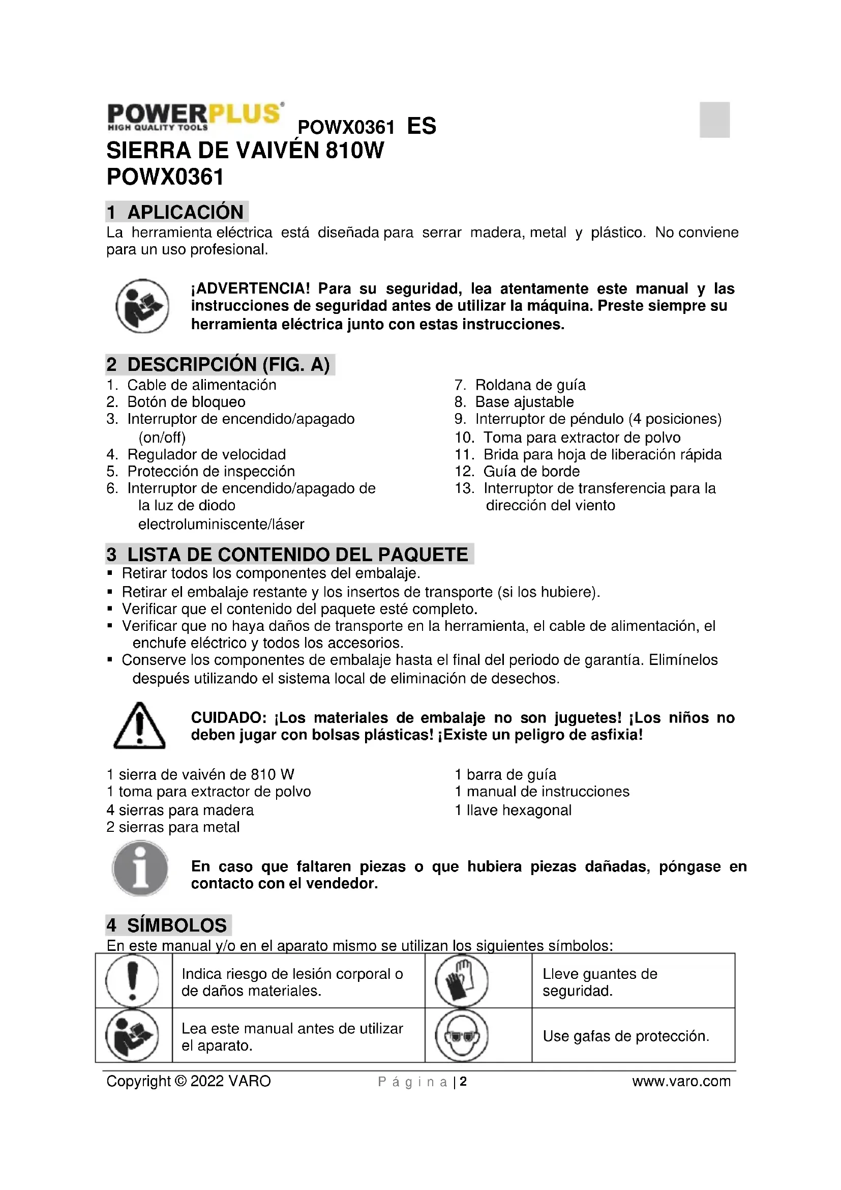 POWX0361 1 APLICACIÓN La herramienta eléctrica está diseñada para serrar madera, metal y plástico. No conviene para un uso profesional. ¡ADVERTENCIA! Para su seguridad, lea atentamente este manual y las instrucciones de seguridad antes de utilizar la máquina. Preste siempre su herramienta eléctrica junto con estas instrucciones. 2 DESCRIPCIÓN (FIG. A)