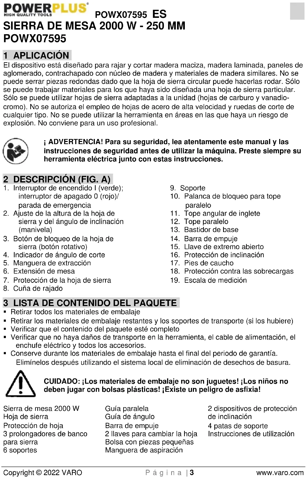 - Conserve durante los materiales de embalaje hasta el final del periodo de garantía. Elimínelos después utilizando el sistema local de eliminación de desechos de basura. CUIDADO: ¡Los materiales de embalaje no son juguetes! ¡Los niños no deben jugar con bolsas plásticas! ¡Existe un peligro de asfixia! Sierra de mesa 2000 W Hoja de sierra Protección de hoja 3 prolongadores de banco para sierra 6 soportes Guía paralela Guía de ángulo Barra de empuje 2 llaves para cambiar la hoja Bolsa con piezas pequeñas Manguera de aspiración 2 dispositivos de protección de inclinación 4 patas de soporte Instrucciones de utilizaciónPOWX07595 ES Copyright © 2022 VARO P á g i n a | 4 www.varo.com En el caso que falten piezas o que haya piezas dañadas, póngase en contacto con el vendedor.