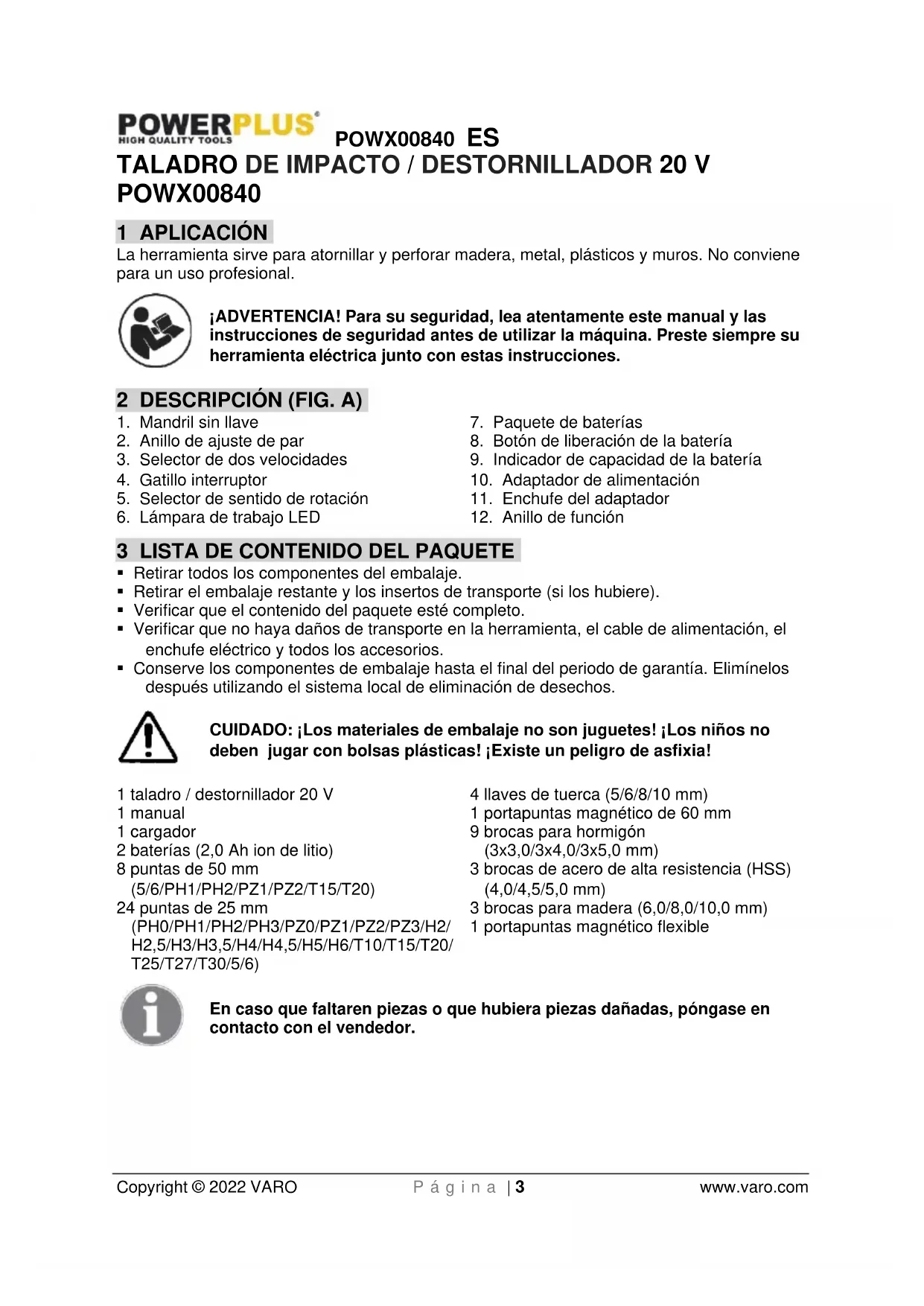 - Conserve los componentes de embalaje hasta el final del periodo de garantía. Elimínelos después utilizando el sistema local de eliminación de desechos. CUIDADO: ¡Los materiales de embalaje no son juguetes! ¡Los niños no deben jugar con bolsas plásticas! ¡Existe un peligro de asfixia! 1 taladro / destornillador 20 V 1 manual 1 cargador 2 baterías (2,0 Ah ion de litio) 8 puntas de 50 mm (5/6/PH1/PH2/PZ1/PZ2/T15/T20) 24 puntas de 25 mm (PH0/PH1/PH2/PH3/PZ0/PZ1/PZ2/PZ3/H2/ H2,5/H3/H3,5/H4/H4,5/H5/H6/T10/T15/T20/ T25/T27/T30/5/6) 4 llaves de tuerca (5/6/8/10 mm) 1 portapuntas magnético de 60 mm 9 brocas para hormigón (3x3,0/3x4,0/3x5,0 mm) 3 brocas de acero de alta resistencia (HSS) (4,0/4,5/5,0 mm) 3 brocas para madera (6,0/8,0/10,0 mm) 1 portapuntas magnético flexible En caso que faltaren piezas o que hubiera piezas dañadas, póngase en contacto con el vendedor.POWX00840 ES Copyright © 2022 VARO P á g i n a | 4 www.varo.com 4 SÍMBOLOS En este manual y/o en el aparato mismo se utilizan los siguientes símbolos: