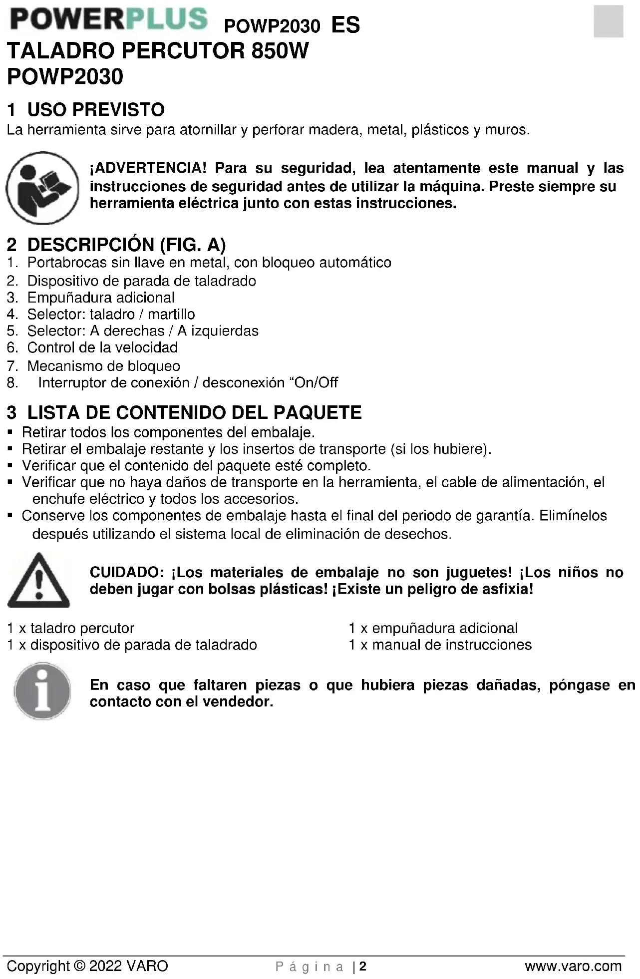 - Mantenga firmemente el taladro para controlar la rotación.POWP2030 ES Copyright © 2022 VARO P á g i n a | 7 www.varo.com Advertencia:Si el taladro se bloquea, suelte inmediatamente el gatillo, retire el taladro del objeto que se esté trabajando y determine la causa del bloqueo. No pulse el interruptor dado que se puede dañar el motor.