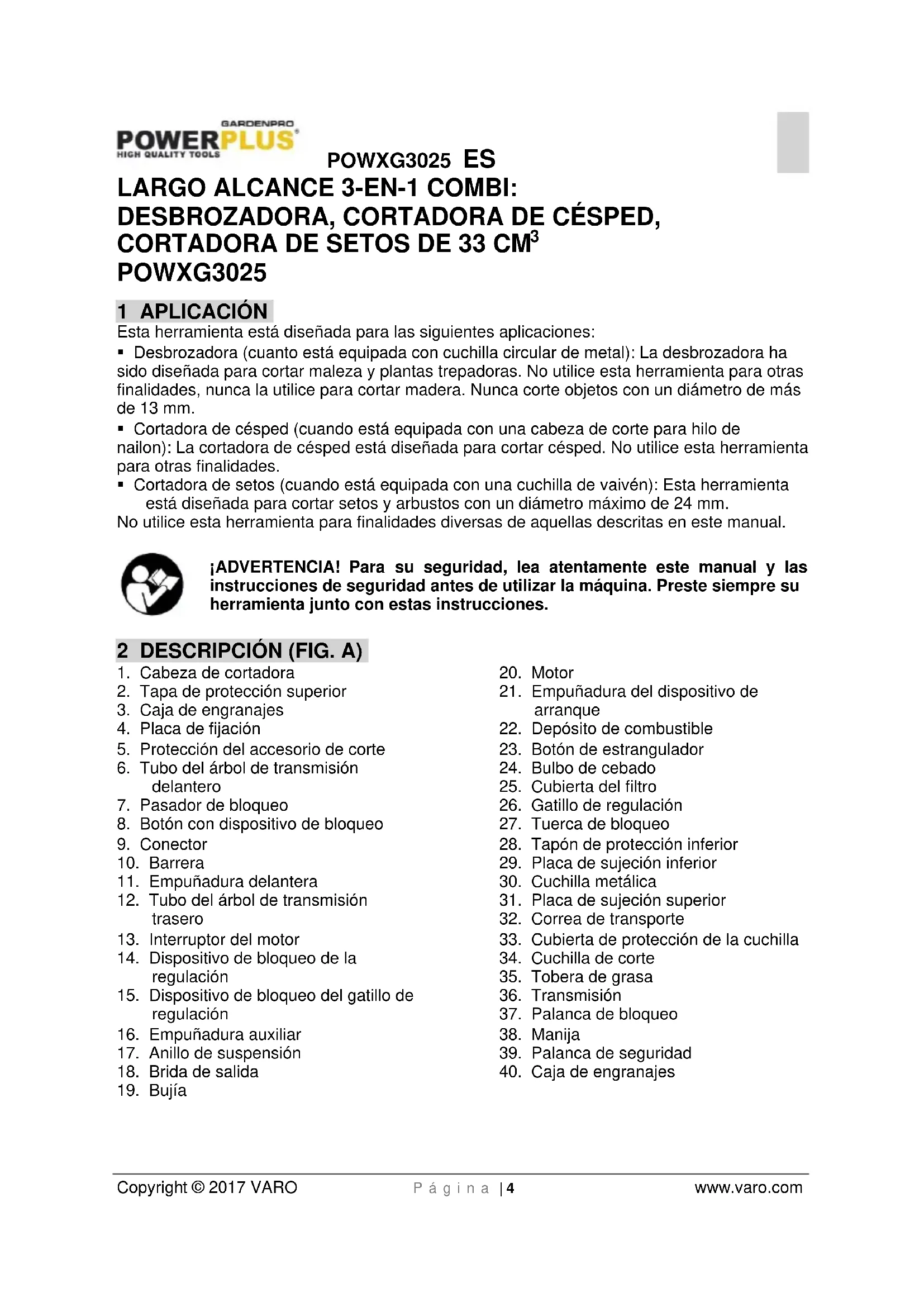 anormalmente Filtro de aire obstruido Limpiar o cambiar el filtro (ver capítulo 5) Piezas dañadas o flojas Parar la máquina y desconectar el cable de bujía. Examinar para detector daños. Verificar y apretar cualquier pieza floja. Recurrir sólo a un centro especializado para hacer todas las verificaciones, reparaciones y cambios. Problema de carburación Ponerse en contacto con el vendedorPOWXG3025 ES Copyright © 2017 VARO P á g i n a | 23 www.varo.com 16 GARANTÍA Este producto está garantizado por un periodo de 36 meses, efectivos desde la fecha de compra por el primer usuario. Esta garantía cubre cualquier fallo de material o de producción excluyendo: baterías, cargadores, piezas defectuosas debido al desgaste normal tales como rodamientos, escobillas, cables y enchufes, o accesorios tales como brocas, hojas de sierra, etc.; los daños o defectos causados por uso abusivo, accidentes o alteraciones del producto; ni los costes de transporte. Los daños y/o defectos que fueren la consecuencia de un uso indebido tampoco están cubiertos por las disposiciones de esta garantía. Igualmente, declinamos toda responsabilidad por lesiones corporales causadas por el uso inadecuado de la herramienta. Las reparaciones deben ser efectuadas por un centro autorizado de servicio al cliente para herramientas Powerplus. Se puede obtener más información llamando al número de teléfono 00 32 3 292 92 90. El cliente correrá siempre con todos los costes de transporte, salvo si se conviene lo contrario por escrito. Al mismo tiempo, si el daño del aparato es la consecuencia de una sobrecarga o de un mantenimiento negligente, no se aceptará ninguna reclamación en el marco de la garantía. Se excluye definitivamente de la garantía los daños que fueren la consecuencia de una penetración de líquido o de polvo en exceso, los daños intencionales (aposta o por gran negligencia), así como el resultado de un uso inadecuado (utilización para fines para los cuales no está adaptado), incompetente (por ejemplo, incumpliendo las instrucciones contenidas en este manual), de un ensamblaje realizado por una persona sin experiencia, de rayos, de una tensión incorrecta de la red. Esta lista no es completa. La aceptación de reclamaciones en el marco de la garantía nunca puede conducir a la prolongación del periodo de validez de ésta ni al inicio de un nuevo periodo de garantía, en caso de reemplazo del aparato. Los aparatos o piezas reemplazadas en el marco de la garantía serán, por lo tanto, propiedad de Varo NV. Nos reservamos el derecho de rechazar toda reclamación en la que no se pueda verificar la fecha de compra o que no se pueda demostrar un correcto mantenimiento (limpieza frecuente de las rejillas de ventilación e intervención regular de servicio en las escobillas, etc.). Debe conservar el recibo de compra como prueba de la fecha de compra. Debe devolver al vendedor la máquina no desmontada, en un estado de limpieza aceptable, en su maleta original (en caso de que se hubiere entregado la máquina en un una maleta), acompañada de su recibo de compra. 17 MEDIO AMBIENTE Si al cabo de un largo periodo de utilización debiere cambiar la máquina, no la deseche entre los residuos domésticos. Deshágase de ella de una forma que fuere compatible con la protección del medio ambiente. Elimine el aceite del motor de modo que respete el medio ambiente. Le sugerimos que lo envase en un contenedor sellado y lo envíe a un servicio de recogida local de residuos. No lo tire en la basura ni lo vierta en el suelo.POWXG3025 ES Copyright © 2017 VARO P á g i n a | 24 www.varo.com