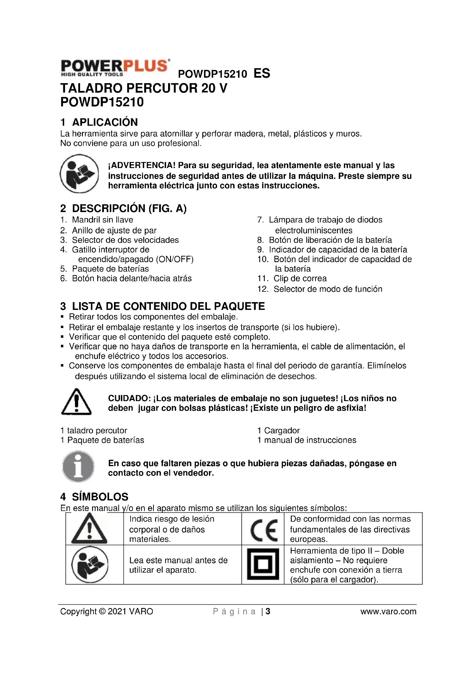 Herramienta de tipo II – Doble aislamiento – No requiere enchufe con conexión a tierra (sólo para el cargador).POWDP15210 ES Copyright © 2021 VARO P á g i n a | 4 www.varo.com