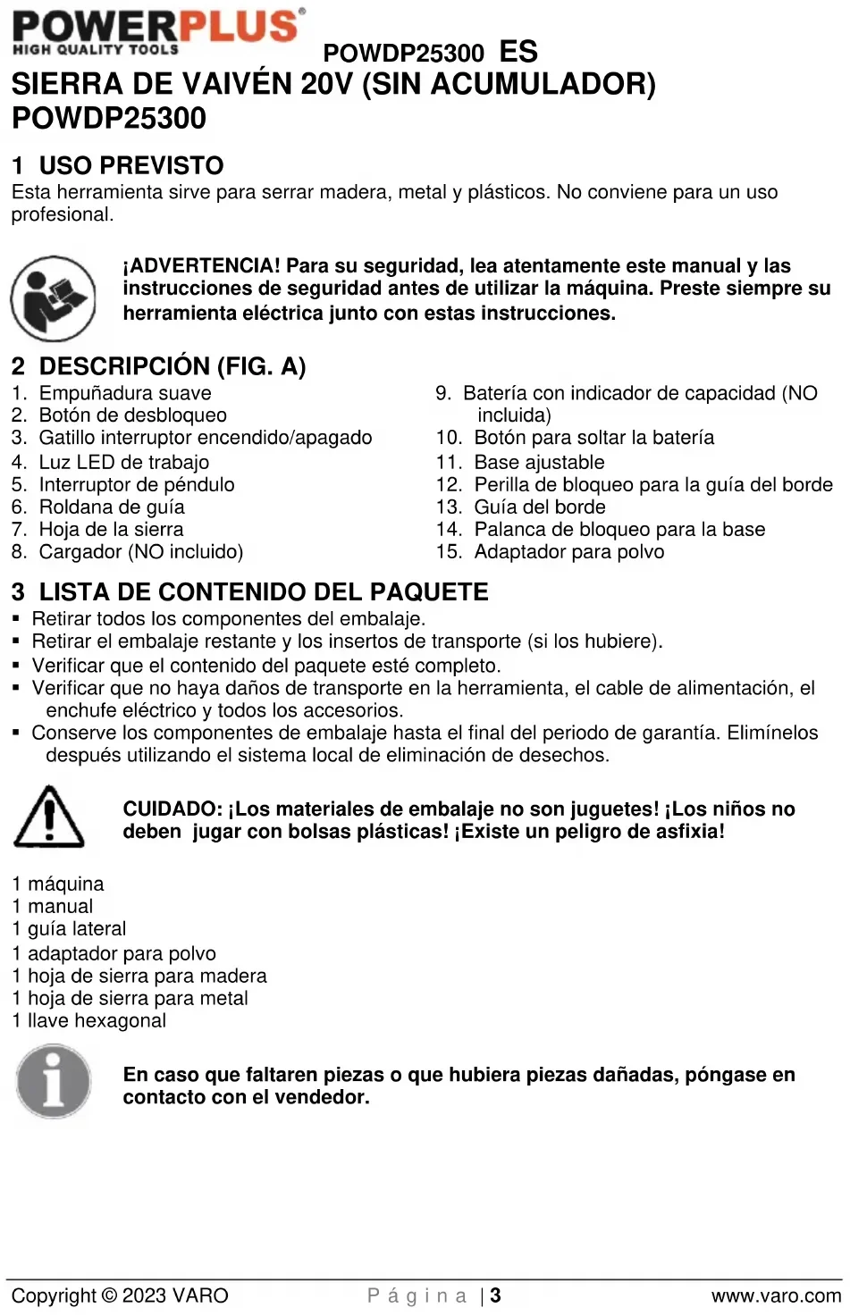 Copyright © 2023 VARO P á g i n a | 3 www.varo.com SIERRA DE VAIVÉN 20V (SIN ACUMULADOR) POWDP25300 1 USO PREVISTO Esta herramienta sirve para serrar madera, metal y plásticos. No conviene para un uso profesional. ¡ADVERTENCIA! Para su seguridad, lea atentamente este manual y las instrucciones de seguridad antes de utilizar la máquina. Preste siempre su herramienta eléctrica junto con estas instrucciones. 2 DESCRIPCIÓN (FIG. A)