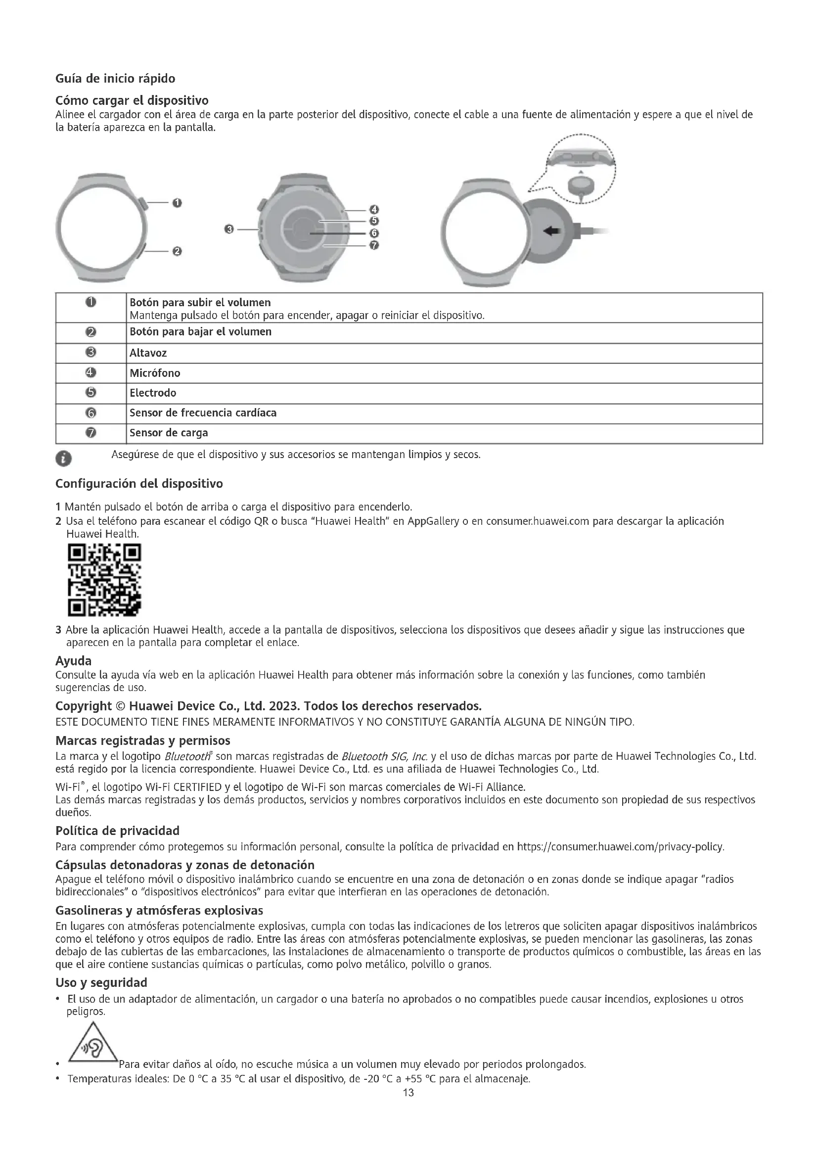 Sensor de carga Asegúrese de que el dispositivo y sus accesorios se mantengan limpios y secos. Conguración del dispositivo 1 Mantén pulsado el botón de arriba o carga el dispositivo para encenderlo. 2 Usa el teléfono para escanear el código QR o busca “Huawei Health” en AppGallery o en consumer.huawei.com para descargar la aplicación Huawei Health. 3 Abre la aplicación Huawei Health, accede a la pantalla de dispositivos, selecciona los dispositivos que desees añadir y sigue las instrucciones que aparecen en la pantalla para completar el enlace. Ayuda Consulte la ayuda vía web en la aplicación Huawei Health para obtener más información sobre la conexión y las funciones, como también sugerencias de uso. Copyright © Huawei Device Co., Ltd. 2023. Todos los derechos reservados. ESTE DOCUMENTO TIENE FINES MERAMENTE INFORMATIVOS Y NO CONSTITUYE GARANTÍA ALGUNA DE NINGÚN TIPO. Marcas registradas y permisos La marca y el logotipo Bluetooth