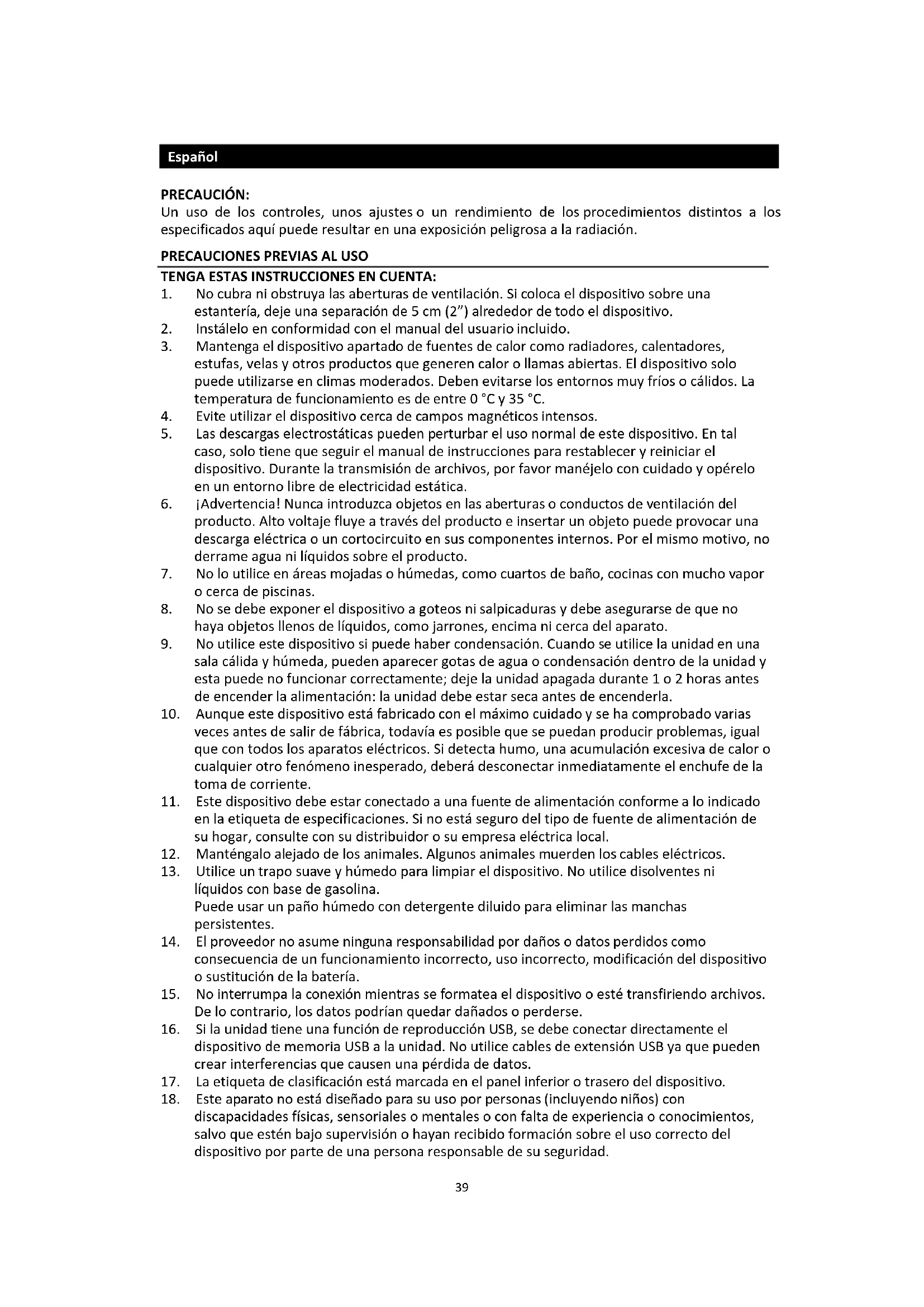 15. No interrumpa la conexión mientras se formatea el dispositivo o esté transfiriendo archivos.