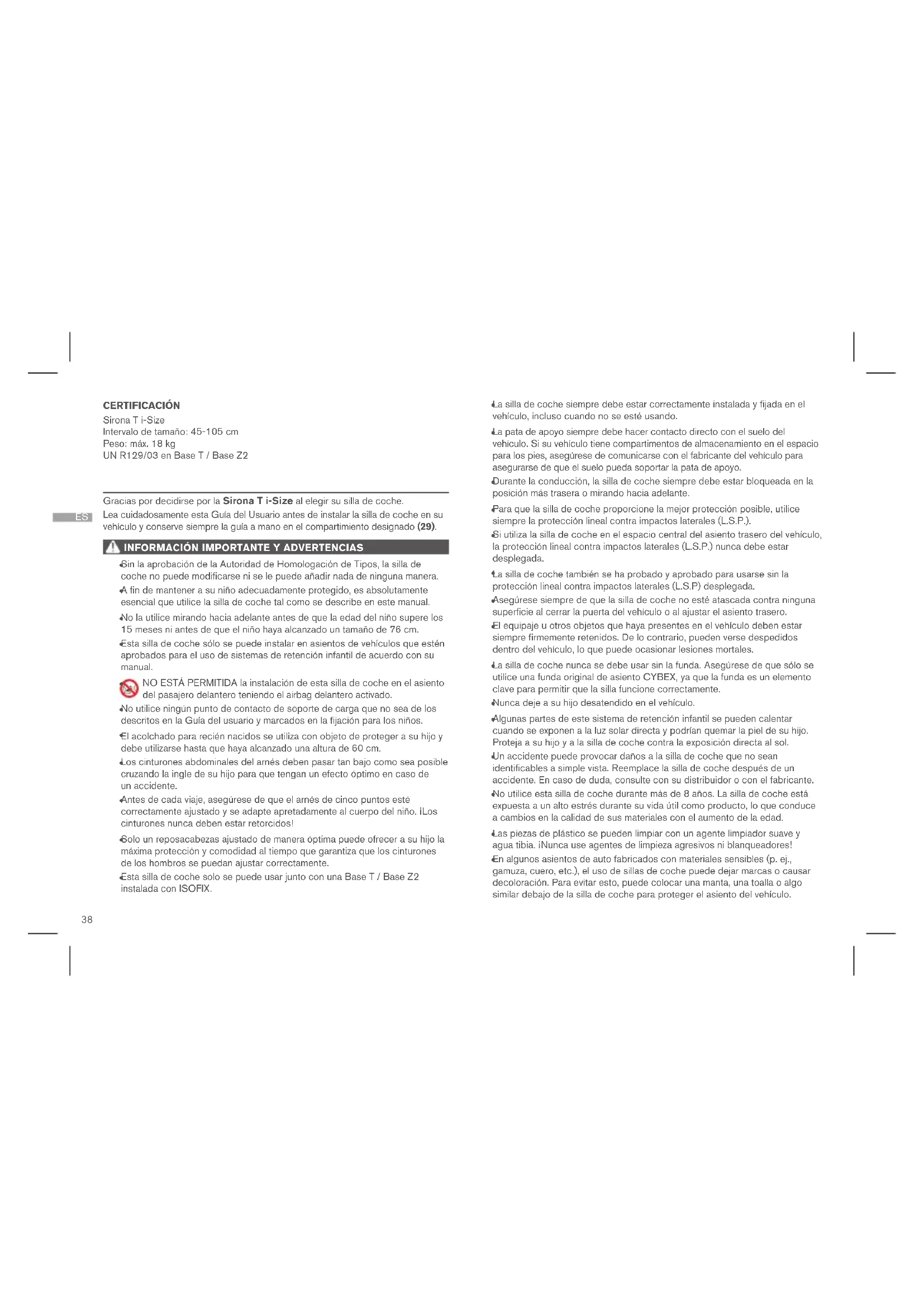 Gracias por decidirse por la Sirona T i-Size al elegir su silla de coche. Lea cuidadosamente esta Guía del Usuario antes de instalar la silla de coche en su vehículo y conserve siempre la guía a mano en el compartimiento designado (29).