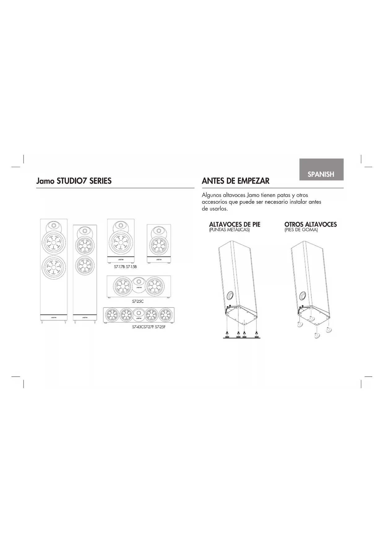 Algunos altavoces Jamo tienen patas y otros accesorios que puede ser necesario instalar antes de usarlos.