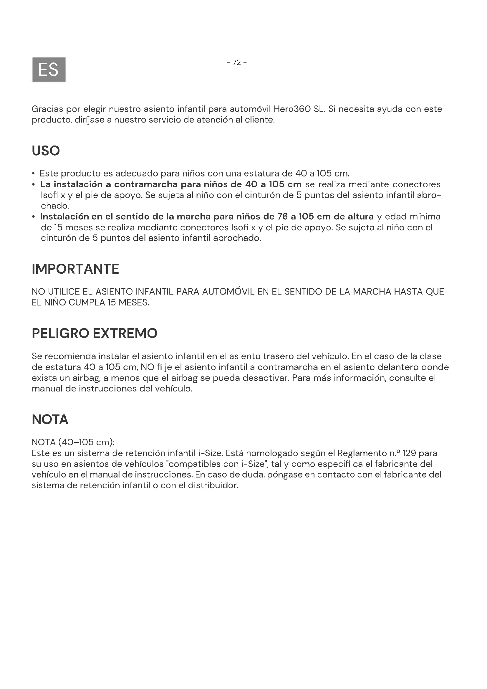 - Instalación en el sentido de la marcha para niños de 76 a 105cm de altura y edad mínima de 15 meses se realiza mediante conectores Isofi x y el pie de apoyo. Se sujeta al niño con el cinturón de 5 puntos del asiento infantil abrochado. IMPORTANTE NO UTILICE EL ASIENTO INFANTIL PARA AUTOMÓVIL EN EL SENTIDO DE LA MARCHA HASTA QUE EL NIÑO CUMPLA 15 MESES. PELIGRO EXTREMO Se recomienda instalar el asiento infantil en el asiento trasero del vehículo. En el caso de la clase de estatura 40 a 105cm, NO fi je el asiento infantil a contramarcha en el asiento delantero donde exista un airbag, a menos que el airbag se pueda desactivar. Para más información, consulte el manual de instrucciones del vehículo. NOTA NOTA (40–105 cm): Este es un sistema de retención infantil i-Size. Está homologado según el Reglamento n.º 129 para su uso en asientos de vehículos "compatibles con i-Size", tal y como especifi ca el fabricante del vehículo en el manual de instrucciones. En caso de duda, póngase en contacto con el fabricante del sistema de retención infantil o con el distribuidor.- 73 -