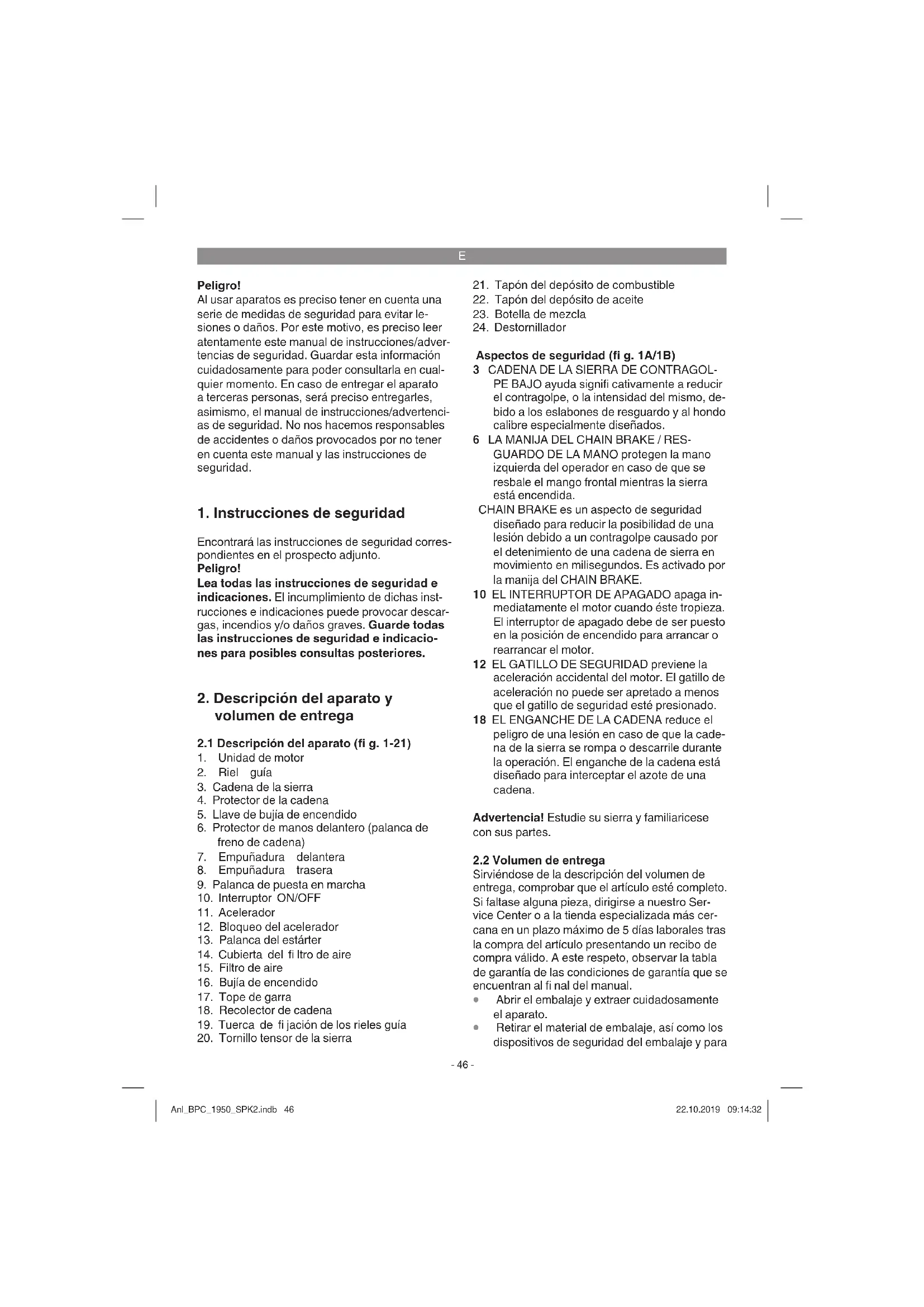 Peligro! Arrancar el motor sólo una vez que la sierra esté completamente montada. Peligro! Llevar puestos guantes de protección en todo momento al manipular la cadena. Anl_BPC_1950_SPK2.indb 47Anl_BPC_1950_SPK2.indb 47 22.10.2019 09:14:3222.10.2019 09:14:32E