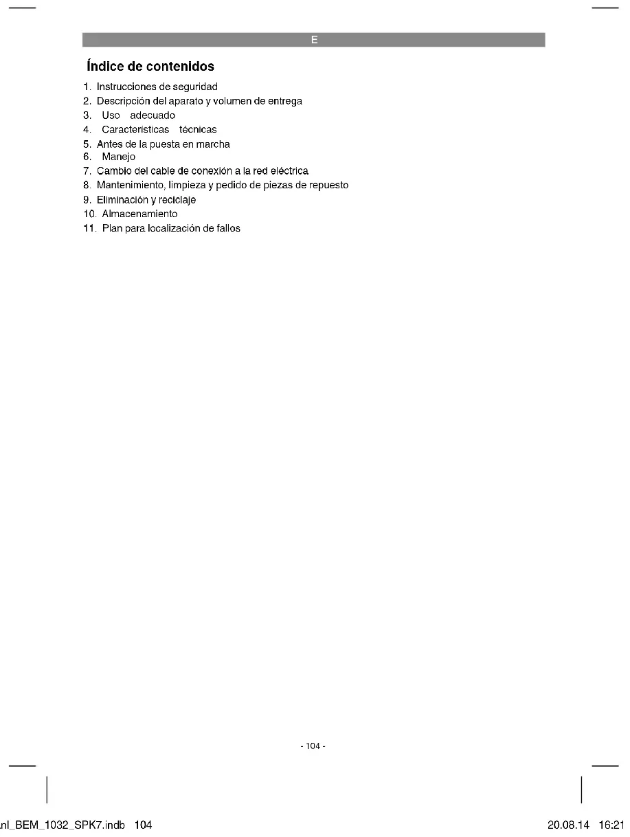 Peligro! - Leer el manual de instrucciones para reducir cualquier riesgo de sufrir daños Los niños no deben usar el aparato. Vigilar a los niños para asegurar- se de que no jueguen con el aparato. Los niños no pueden limpiar ni realizar trabajos de mantenimiento en el aparato. El aparato no puede ser utilizado por personas cuyas capacidades estén limitadas física, sensorial o psíquicamente, o que no dispongan de la experi- encia y/o los conocimientos necesarios a no ser que estén vigiladas o hayan recibido instrucciones de una persona que se responsabilice de ellos. Cuando el cable de conexión a la red de este aparato esté dañado, deberá ser sustituido por el fabricante o su servicio de asistencia té- cnica o por una persona cualifi cada para ello, evitando así cualquier peligro. Anl_BEM_1032_SPK7.indb 105Anl_BEM_1032_SPK7.indb 105 20.08.14 16:2120.08.14 16:21E
