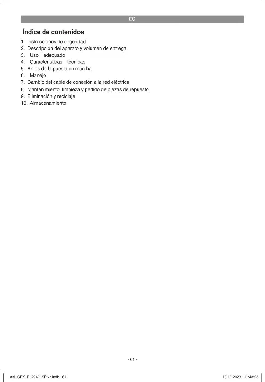 Si es posible, almacenar el embalaje hasta que transcurra el periodo de garantía. Peligro! ¡El aparato y el material de embalaje no son un juguete! ¡No permitir que los niños jue- guen con bolsas de plástico, láminas y pie- zas pequeñas! ¡Riesgo de ingestión y asfi xia! Anl_GEK_E_2240_SPK7.indb 62Anl_GEK_E_2240_SPK7.indb 62 13.10.2023 11:48:2813.10.2023 11:48:28ES