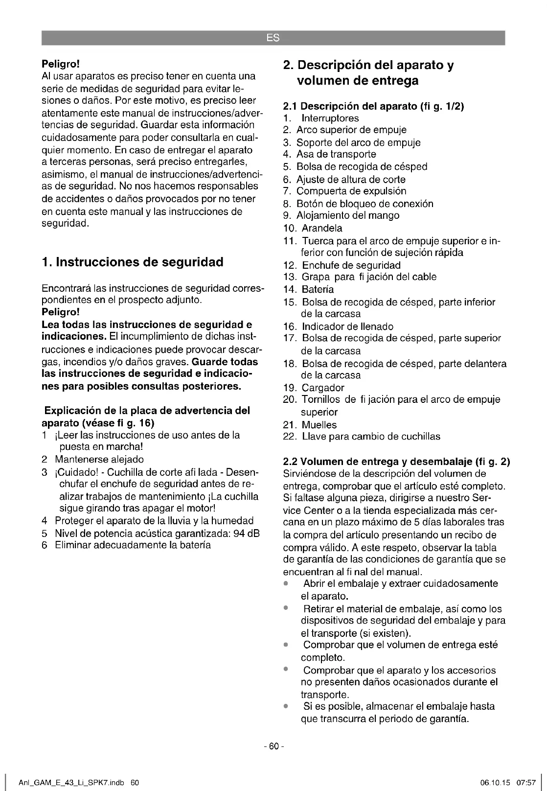 Encontrará las instrucciones de seguridad corres- pondientes en el prospecto adjunto. Peligro! Lea todas las instrucciones de seguridad e indicaciones. El incumplimiento de dichas inst- rucciones e indicaciones puede provocar descar- gas, incendios y/o daños graves. Guarde todas las instrucciones de seguridad e indicacio- nes para posibles consultas posteriores. Explicación de la placa de advertencia del aparato (véase fi g. 16) 1 ¡Leer las instrucciones de uso antes de la puesta en marcha! 2 Mantenerse alejado 3 ¡Cuidado! - Cuchilla de corte afi lada - Desen- chufar el enchufe de seguridad antes de re- alizar trabajos de mantenimiento ¡La cuchilla sigue girando tras apagar el motor! 4 Proteger el aparato de la lluvia y la humedad 5 Nivel de potencia acústica garantizada: 94 dB 6 Eliminar adecuadamente la batería