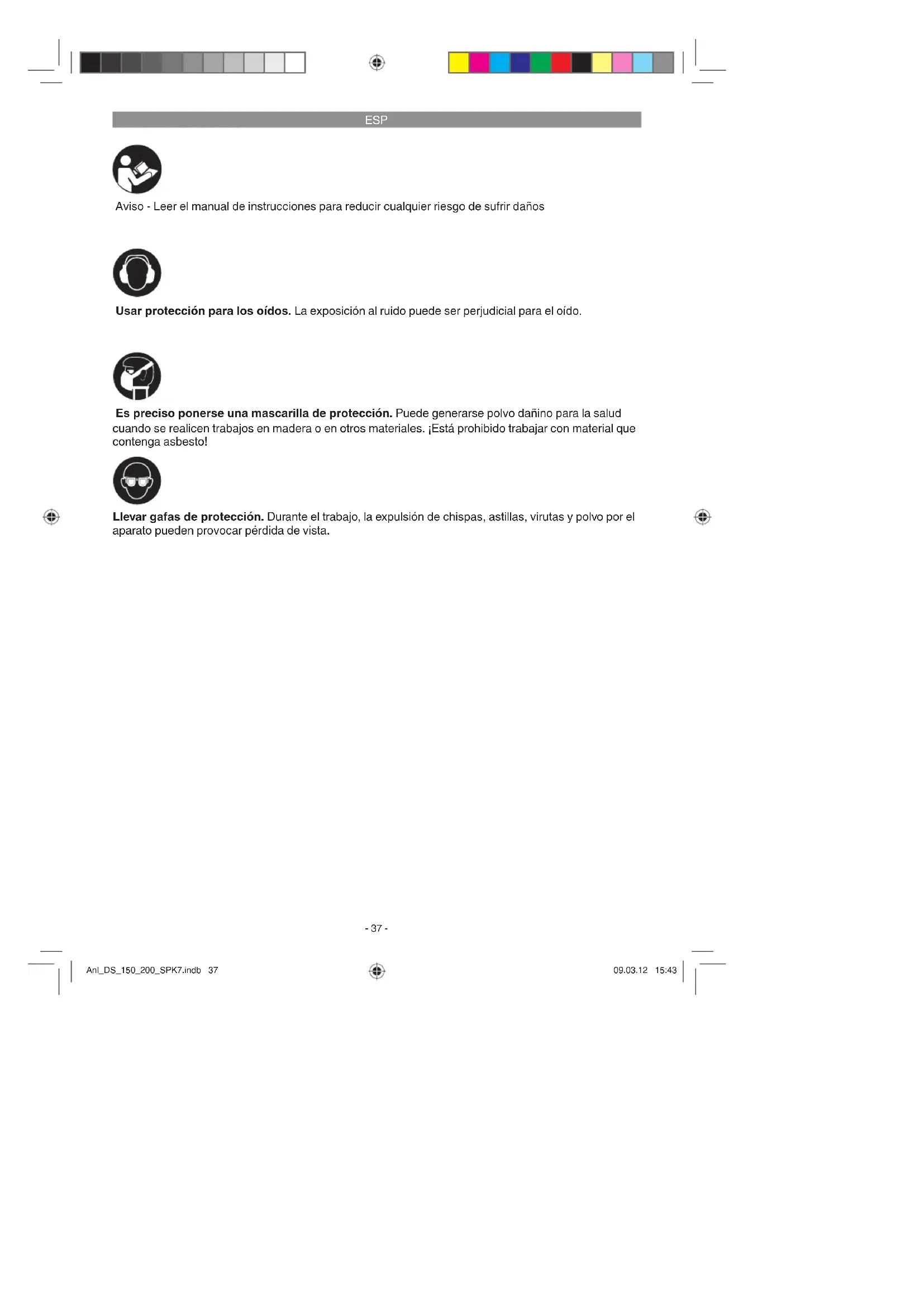 Aviso - Leer el manual de instrucciones para reducir cualquier riesgo de sufrir daños Usar protección para los oídos. La exposición al ruido puede ser perjudicial para el oído. Llevar gafas de protección. Durante el trabajo, la expulsión de chispas, astillas, virutas y polvo por el aparato pueden provocar pérdida de vista. Es preciso ponerse una mascarilla de protección. Puede generarse polvo dañino para la salud cuando se realicen trabajos en madera o en otros materiales. ¡Está prohibido trabajar con material que contenga asbesto! Anl_DS_150_200_SPK7.indb 37Anl_DS_150_200_SPK7.indb 37 09.03.12 15:4309.03.12 15:43ESP