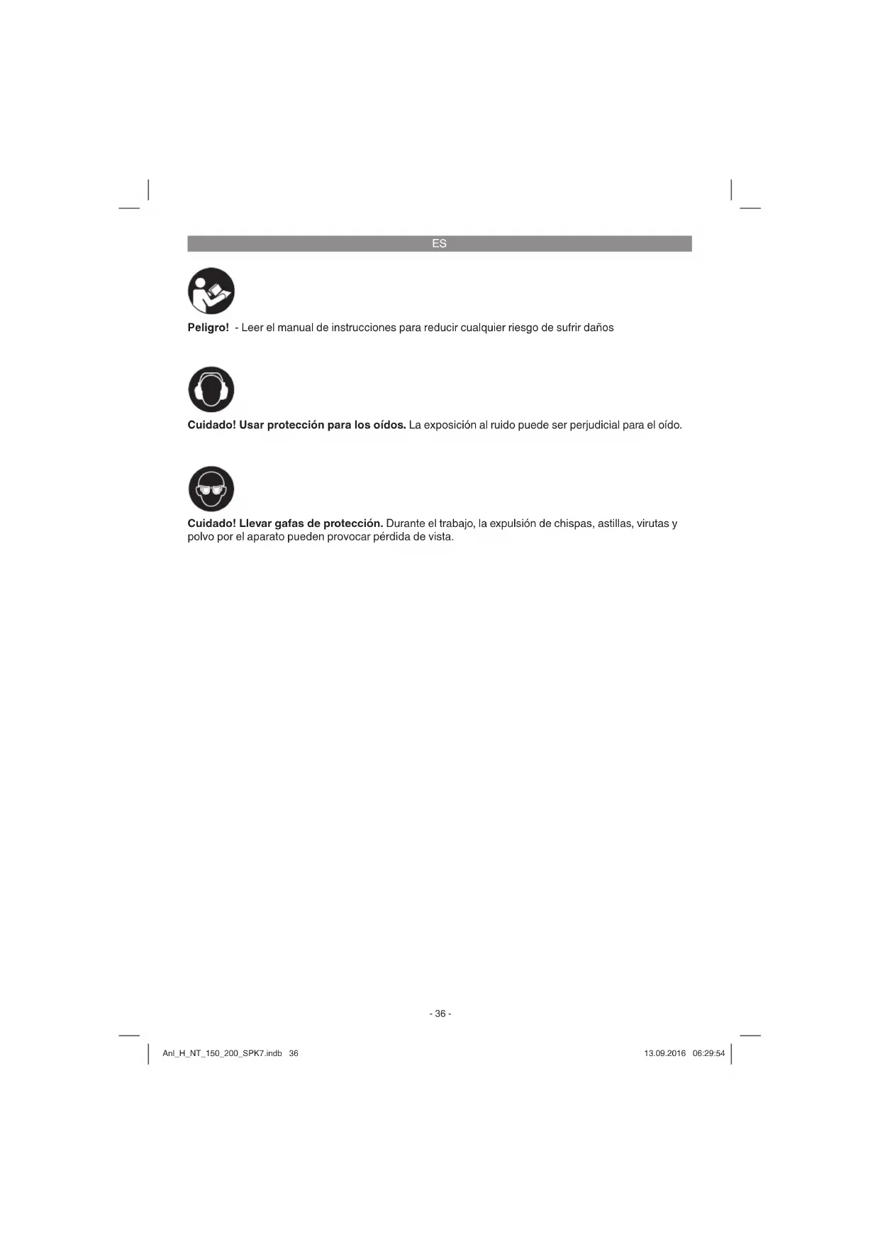Peligro! - Leer el manual de instrucciones para reducir cualquier riesgo de sufrir daños Cuidado! Usar protección para los oídos. La exposición al ruido puede ser perjudicial para el oído. Cuidado! Llevar gafas de protección. Durante el trabajo, la expulsión de chispas, astillas, virutas y polvo por el aparato pueden provocar pérdida de vista. Anl_H_NT_150_200_SPK7.indb 36Anl_H_NT_150_200_SPK7.indb 36 13.09.2016 06:29:5413.09.2016 06:29:54ES