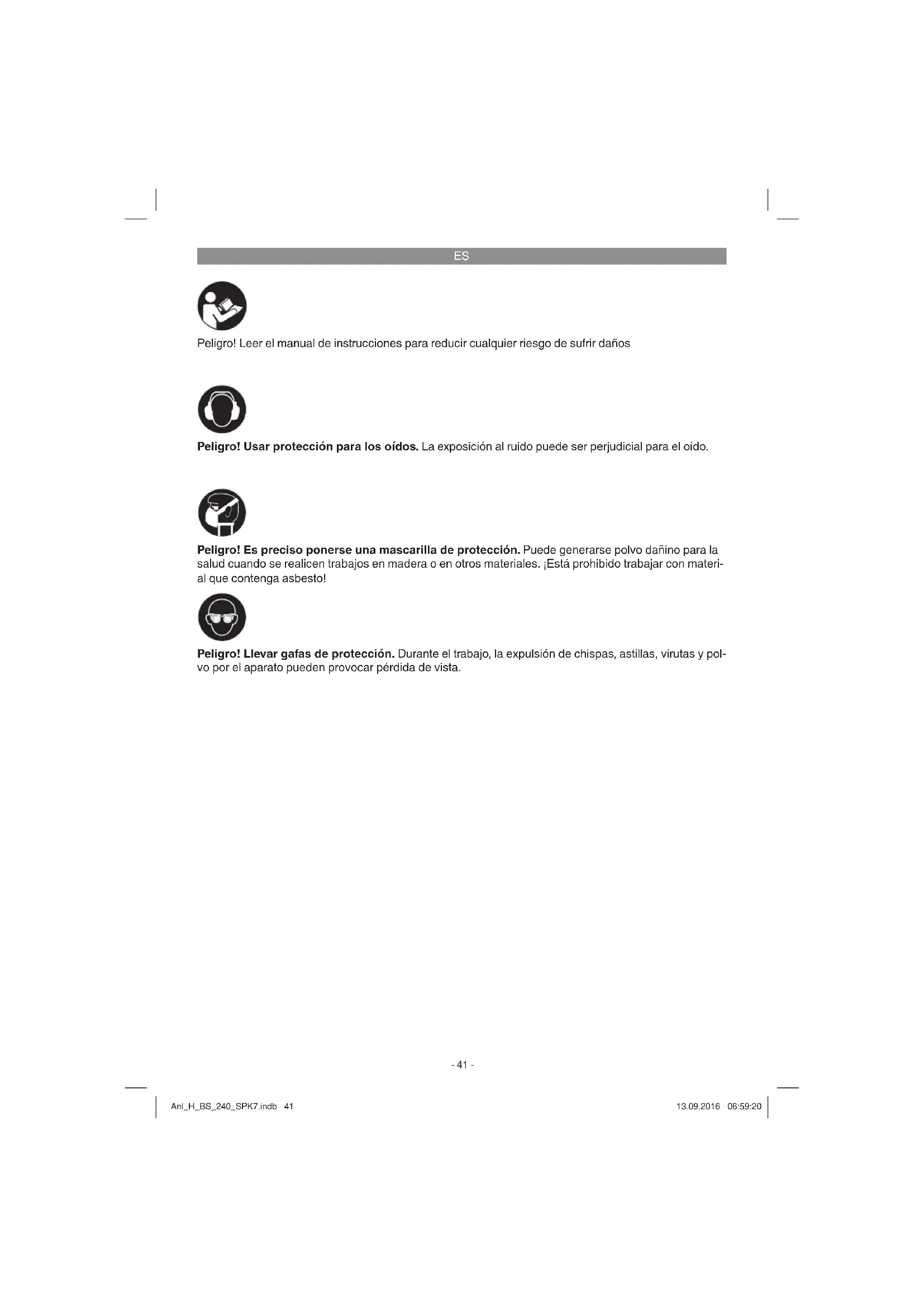Peligro! Leer el manual de instrucciones para reducir cualquier riesgo de sufrir daños Peligro! Usar protección para los oídos. La exposición al ruido puede ser perjudicial para el oído. Peligro! Llevar gafas de protección. Durante el trabajo, la expulsión de chispas, astillas, virutas y pol- vo por el aparato pueden provocar pérdida de vista. Peligro! Es preciso ponerse una mascarilla de protección. Puede generarse polvo dañino para la salud cuando se realicen trabajos en madera o en otros materiales. ¡Está prohibido trabajar con materi- al que contenga asbesto! Anl_H_BS_240_SPK7.indb 41Anl_H_BS_240_SPK7.indb 41 13.09.2016 06:59:2013.09.2016 06:59:20ES