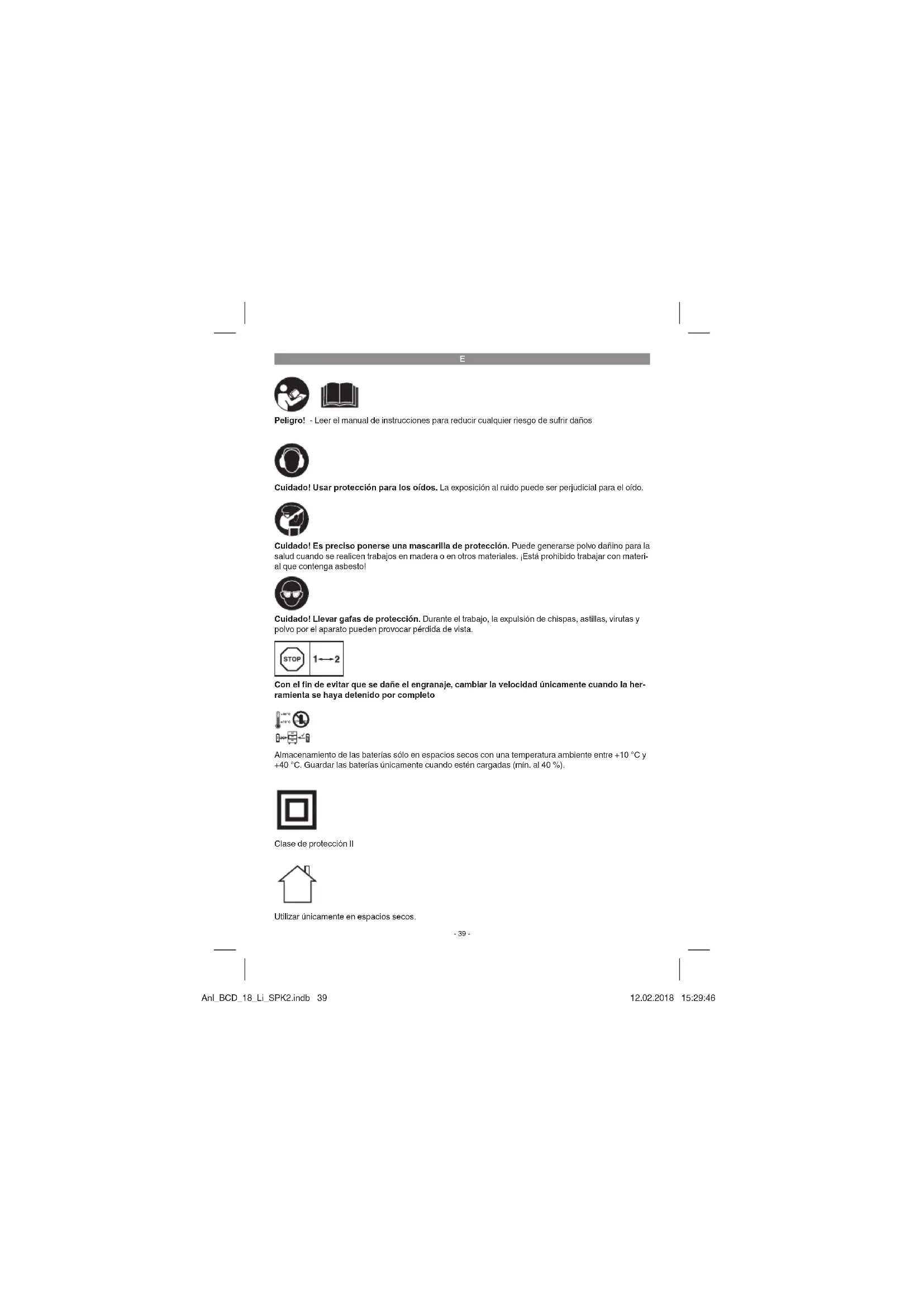 Peligro! - Leer el manual de instrucciones para reducir cualquier riesgo de sufrir daños Cuidado! Usar protección para los oídos. La exposición al ruido puede ser perjudicial para el oído. Cuidado! Llevar gafas de protección. Durante el trabajo, la expulsión de chispas, astillas, virutas y polvo por el aparato pueden provocar pérdida de vista. Cuidado! Es preciso ponerse una mascarilla de protección. Puede generarse polvo dañino para la salud cuando se realicen trabajos en madera o en otros materiales. ¡Está prohibido trabajar con materi- al que contenga asbesto! Con el fi n de evitar que se dañe el engranaje, cambiar la velocidad únicamente cuando la her- ramienta se haya detenido por completo Almacenamiento de las baterías sólo en espacios secos con una temperatura ambiente entre +10 °C y +40 °C. Guardar las baterías únicamente cuando estén cargadas (mín. al 40 %). Utilizar únicamente en espacios secos. Clase de protección II Anl_BCD_18_Li_SPK2.indb 39Anl_BCD_18_Li_SPK2.indb 39 12.02.2018 15:29:4612.02.2018 15:29:46E