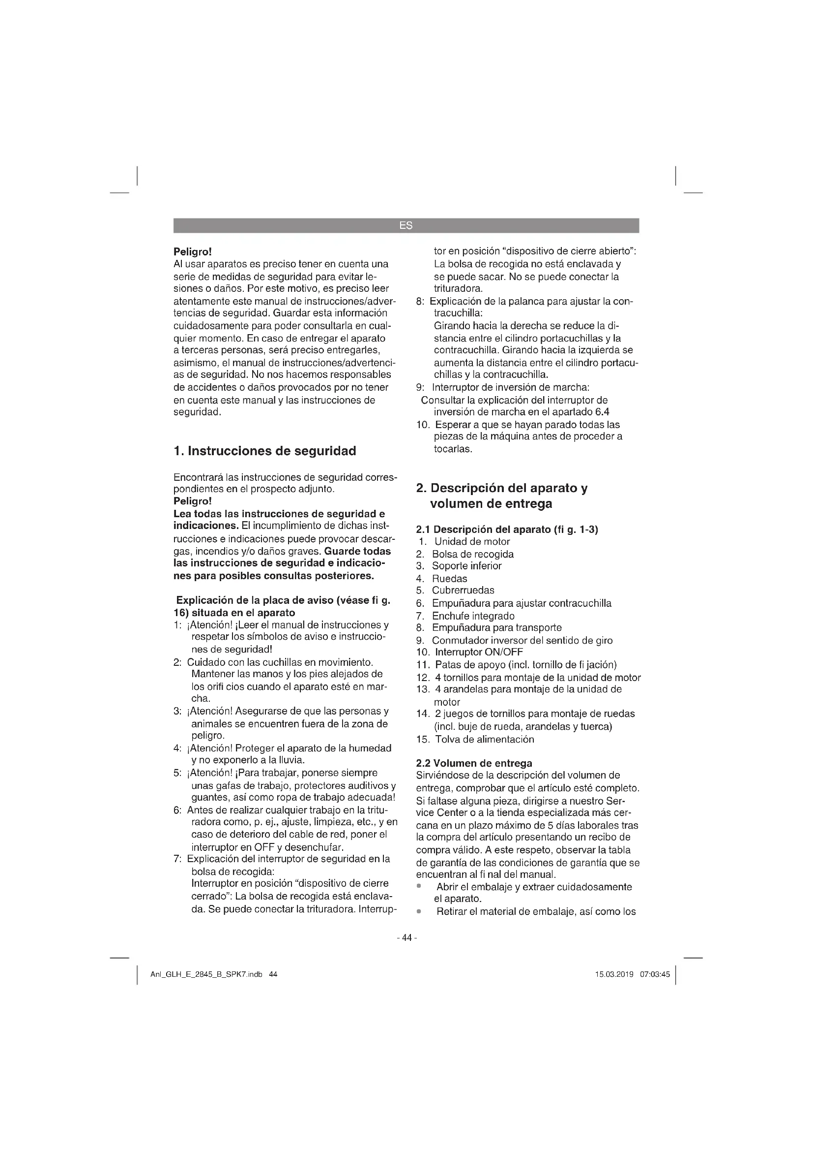 1: ¡Atención! ¡Leer el manual de instrucciones y respetar los símbolos de aviso e instruccio- nes de seguridad! 2: Cuidado con las cuchillas en movimiento. Mantener las manos y los pies alejados de los orifi cios cuando el aparato esté en mar- cha. 3: ¡Atención! Asegurarse de que las personas y animales se encuentren fuera de la zona de peligro. 4: ¡Atención! Proteger el aparato de la humedad y no exponerlo a la lluvia. 5: ¡Atención! ¡Para trabajar, ponerse siempre unas gafas de trabajo, protectores auditivos y guantes, así como ropa de trabajo adecuada! 6: Antes de realizar cualquier trabajo en la tritu- radora como, p. ej., ajuste, limpieza, etc., y en caso de deterioro del cable de red, poner el interruptor en OFF y desenchufar. 7: Explicación del interruptor de seguridad en la bolsa de recogida: Interruptor en posición “dispositivo de cierre cerrado”: La bolsa de recogida está enclava- da. Se puede conectar la trituradora. Interrup- tor en posición “dispositivo de cierre abierto”: La bolsa de recogida no está enclavada y se puede sacar. No se puede conectar la trituradora. 8: Explicación de la palanca para ajustar la con- tracuchilla: Girando hacia la derecha se reduce la di- stancia entre el cilindro portacuchillas y la contracuchilla. Girando hacia la izquierda se aumenta la distancia entre el cilindro portacu- chillas y la contracuchilla. 9: Interruptor de inversión de marcha: Consultar la explicación del interruptor de inversión de marcha en el apartado 6.4