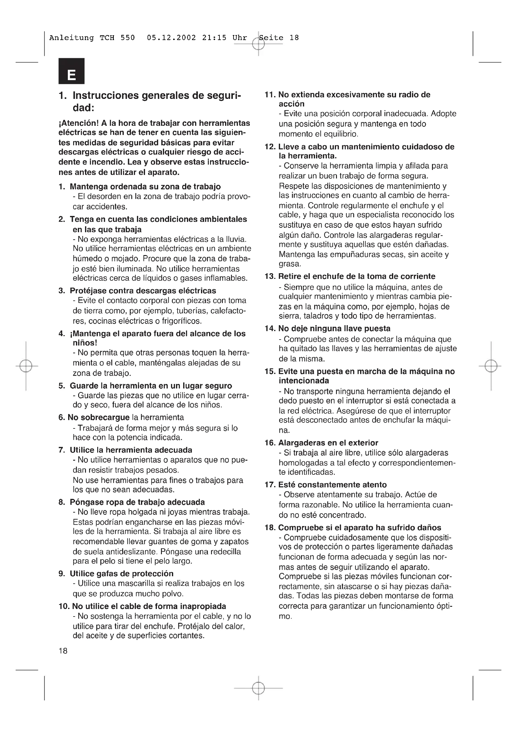 - Compruebe cuidadosamente que los dispositi- vos de protección o partes ligeramente dañadas funcionan de forma adecuada y según las nor- mas antes de seguir utilizando el aparato. Compruebe si las piezas móviles funcionan cor- rectamente, sin atascarse o si hay piezas daña- das. Todas las piezas deben montarse de forma correcta para garantizar un funcionamiento ópti- mo. Anleitung TCH 550 05.12.2002 21:15 Uhr Seite 1819