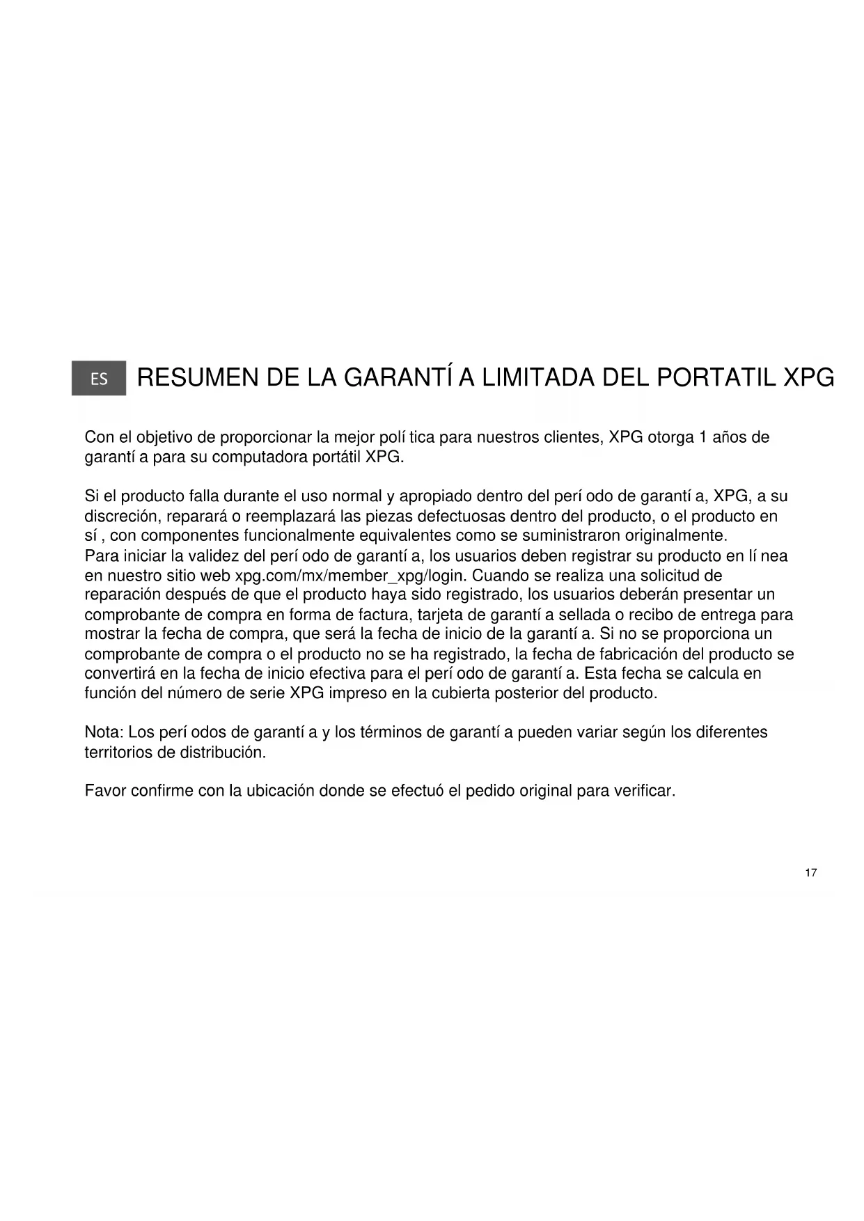 16Con el objetivo de proporcionar la mejor política para nuestros clientes, XPG otorga 1 años de garantía para su computadora portátil XPG. Si el producto falla durante el uso normal y apropiado dentro del período de garantía, XPG, a su discreción, reparará o reemplazará las piezas defectuosas dentro del producto, o el producto en sí, con componentes funcionalmente equivalentes como se suministraron originalmente. Para iniciar la validez del período de garantía, los usuarios deben registrar su producto en línea en nuestro sitio web xpg.com/mx/member_xpg/login. Cuando se realiza una solicitud de reparación después de que el producto haya sido registrado, los usuarios deberán presentar un comprobante de compra en forma de factura, tarjeta de garantía sellada o recibo de entrega para mostrar la fecha de compra, que será la fecha de inicio de la garantía. Si no se proporciona un comprobante de compra o el producto no se ha registrado, la fecha de fabricación del producto se convertirá en la fecha de inicio efectiva para el período de garantía. Esta fecha se calcula en función del número de serie XPG impreso en la cubierta posterior del producto. Nota: Los períodos de garantía y los términos de garantía pueden variar según los diferentes territorios de distribución. Favor confirme con la ubicación donde se efectuó el pedido original para verificar. RESUMEN DE LA GARANTÍA LIMITADA DEL PORTATIL XPG