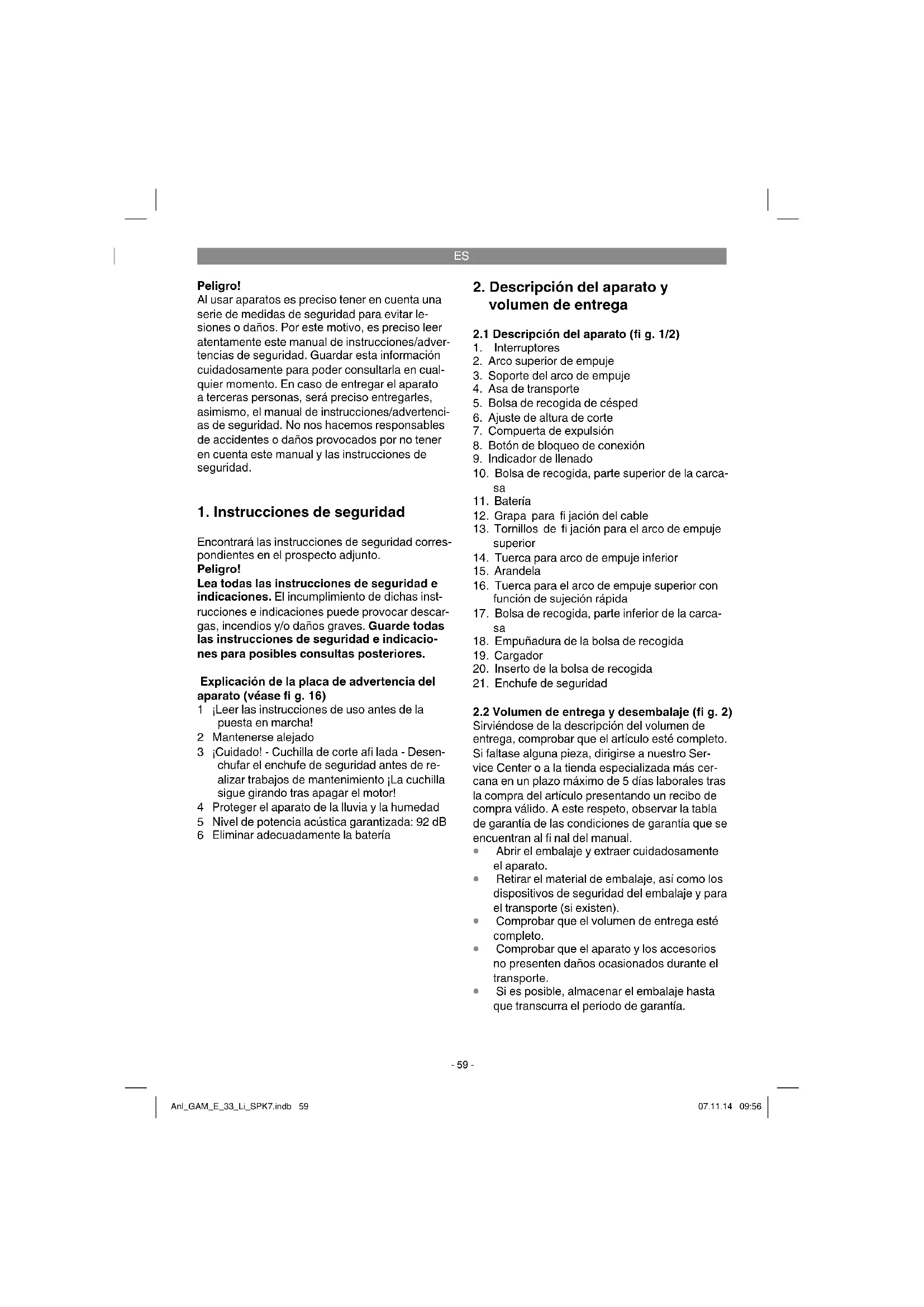 Encontrará las instrucciones de seguridad corres- pondientes en el prospecto adjunto. Peligro! Lea todas las instrucciones de seguridad e indicaciones. El incumplimiento de dichas inst- rucciones e indicaciones puede provocar descar- gas, incendios y/o daños graves. Guarde todas las instrucciones de seguridad e indicacio- nes para posibles consultas posteriores. Explicación de la placa de advertencia del aparato (véase fi g. 16) 1 ¡Leer las instrucciones de uso antes de la puesta en marcha! 2 Mantenerse alejado 3 ¡Cuidado! - Cuchilla de corte afi lada - Desen- chufar el enchufe de seguridad antes de re- alizar trabajos de mantenimiento ¡La cuchilla sigue girando tras apagar el motor! 4 Proteger el aparato de la lluvia y la humedad 5 Nivel de potencia acústica garantizada: 92 dB 6 Eliminar adecuadamente la batería