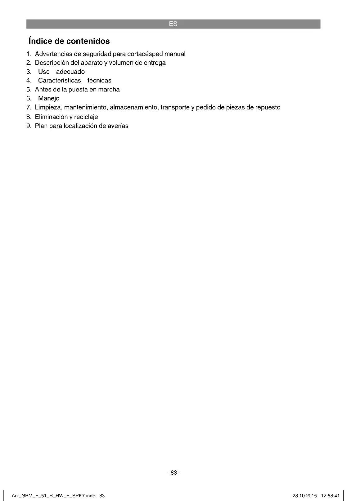Sólo para países miembros de la UE No tirar herramientas eléctricas en la basura casera. Según la directiva europea 2012/19/CE sobre aparatos usados electrónicos y eléctricos y su aplicación en el derecho nacional, dichos aparatos deberán recojerse por separado y eliminarse de modo ecológi- co para facilitar su posterior reciclaje. Alternativa de reciclaje en caso de devolución: El propietario del aparato eléctrico, en caso de no optar por su devolución, está obligado a reciclar ade- cuadamente dicho aparato eléctrico. Para ello, también se puede entregar el aparato usado a un centro de reciclaje que trate la eliminación de residuos respetando la legislación nacional sobre residuos y su reciclaje. Esto no afecta a los medios auxiliares ni a los accesorios sin componentes eléctricos que acompañan a los aparatos usados. Sólo está permitido copiar la documentación y documentos anexos del producto, o extractos de los mismos, con autorización expresa de iSC GmbH. Nos reservamos el derecho a realizar modifi caciones técnicas Anl_GBM_E_51_R_HW_E_SPK7.indb 99Anl_GBM_E_51_R_HW_E_SPK7.indb 99 28.10.2015 12:58:4328.10.2015 12:58:43ES