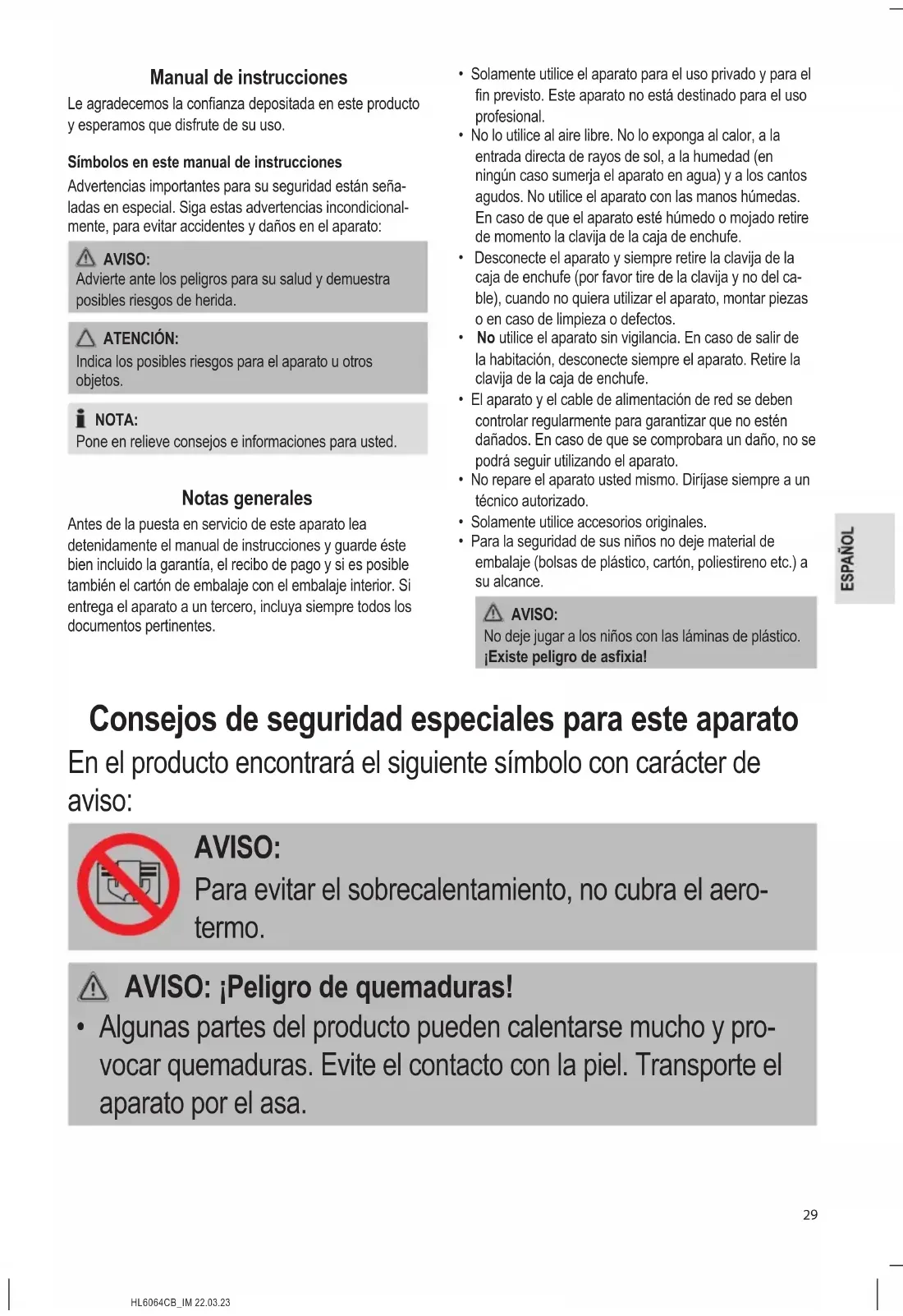 - Para la seguridad de sus niños no deje material de embalaje (bolsas de plástico, cartón, poliestireno etc.) a su alcance. AVISO: No deje jugar a los niños con las láminas de plástico. ¡Existe peligro de asxia! Consejos de seguridad especiales para este aparato En el producto encontrará el siguiente símbolo con carácter de aviso: AVISO: Para evitar el sobrecalentamiento, no cubra el aero- termo. AVISO: ¡Peligro de quemaduras!