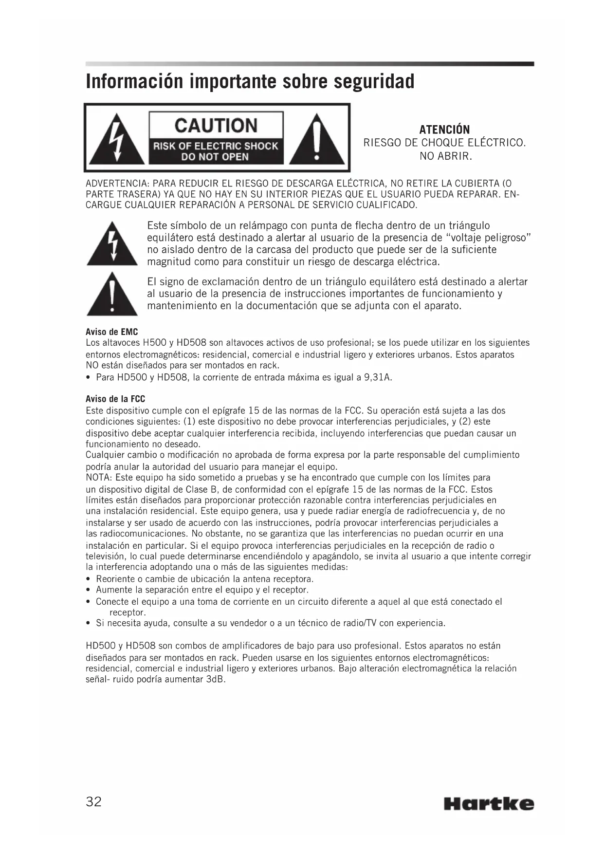 Nominale Ausgangsleistung 500 Watt Spitze / 250 Watt RMS Nominaler Eingangspegel 77,46mv rms (@1kHz) Gesamtklirrfaktor 0,54% (@1dB unter nominalem Ausgang, Richtwert von 1kHz) Signal-Rausch-Verhältnis 1W/49,3dBu (1Wrms @1kHz) Lautsprecherausgabe Signalverstärkung 37,1Vrms Signalverstärkung an Ausgang „Direct Out“ 4,2Vrms Mittlere Frequenz Equalizer Bass 70Hz Midrange 700Hz Treble 5kHz Shape-Regler 100 - 900Hz Sicherungsnennstrom 220V-240V:T2AL AC250V 100V-120V:T4AL AC250V Gewicht 34,39lb 15,6kg Abmessungen (LxBxH) 498mm x 305mm x 515mm 19,6” x 12” x 20,27” Technische Daten Bei Hartke arbeiten wir kontinuierlich an der Verbesserung unserer Produkte, weshalb technische Daten und Design unangekündigt Änderungen unterliegen können.32 Información importante sobre seguridad ADVERTENCIA: PARA REDUCIR EL RIESGO DE DESCARGA ELÉCTRICA, NO RETIRE LA CUBIERTA (O PARTE TRASERA) YA QUE NO HAY EN SU INTERIOR PIEZAS QUE EL USUARIO PUEDA REPARAR. EN- CARGUE CUALQUIER REPARACIÓN A PERSONAL DE SERVICIO CUALIFICADO. Este símbolo de un relámpago con punta de flecha dentro de un triángulo equilátero está destinado a alertar al usuario de la presencia de “voltaje peligroso” no aislado dentro de la carcasa del producto que puede ser de la suficiente magnitud como para constituir un riesgo de descarga eléctrica. El signo de exclamación dentro de un triángulo equilátero está destinado a alertar al usuario de la presencia de instrucciones importantes de funcionamiento y mantenimiento en la documentación que se adjunta con el aparato. ATENCIÓN RIESGO DE CHOQUE ELÉCTRICO. NO ABRIR. Aviso de EMC Los altavoces H500 y HD508 son altavoces activos de uso profesional; se los puede utilizar en los siguientes entornos electromagnéticos: residencial, comercial e industrial ligero y exteriores urbanos. Estos aparatos NO están diseñados para ser montados en rack.