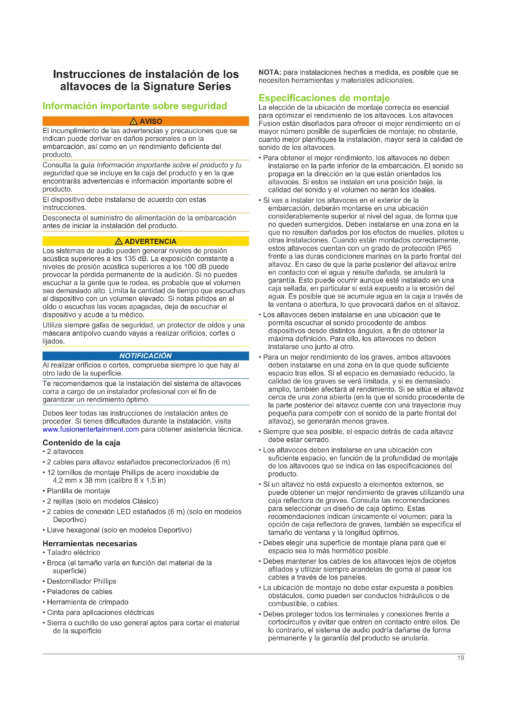 - Vollständig mit absorbierendem Material ausgekleidet 17** Mit absorbierendem Material ausgekleidet 18Instrucciones de instalación de los altavoces de la Signature Series Información importante sobre seguridad AVISO El incumplimiento de las advertencias y precauciones que se indican puede derivar en daños personales o en la embarcación, así como en un rendimiento deficiente del producto. Consulta la guía Información importante sobre el producto y tu seguridad que se incluye en la caja del producto y en la que encontrarás advertencias e información importante sobre el producto. El dispositivo debe instalarse de acuerdo con estas instrucciones. Desconecta el suministro de alimentación de la embarcación antes de iniciar la instalación del producto. ADVERTENCIA Los sistemas de audio pueden generar niveles de presión acústica superiores a los 135 dB. La exposición constante a niveles de presión acústica superiores a los 100 dB puede provocar la pérdida permanente de la audición. Si no puedes escuchar a la gente que te rodea, es probable que el volumen sea demasiado alto. Limita la cantidad de tiempo que escuchas el dispositivo con un volumen elevado. Si notas pitidos en el oído o escuchas las voces apagadas, deja de escuchar el dispositivo y acude a tu médico. Utiliza siempre gafas de seguridad, un protector de oídos y una máscara antipolvo cuando vayas a realizar orificios, cortes o lijados. NOTIFICACIÓN Al realizar orificios o cortes, comprueba siempre lo que hay al otro lado de la superficie. Te recomendamos que la instalación del sistema de altavoces corra a cargo de un instalador profesional con el fin de garantizar un rendimiento óptimo. Debes leer todas las instrucciones de instalación antes de proceder. Si tienes dificultades durante la instalación, visita www.fusionentertainment.com para obtener asistencia técnica. Contenido de la caja