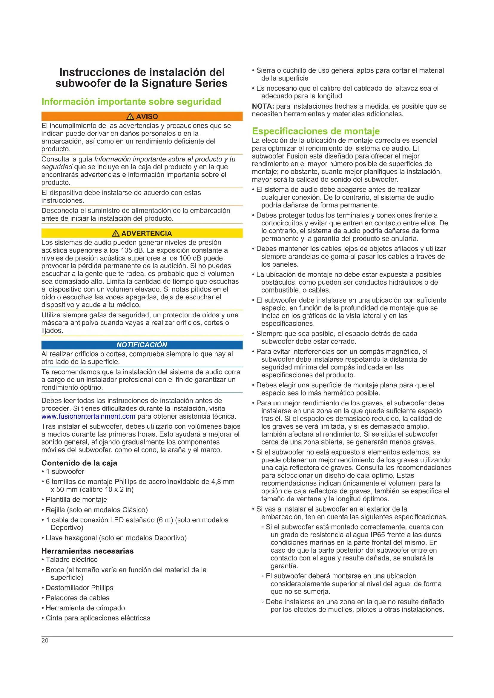 - Vollständig mit absorbierendem Material ausgekleidet. ** Mit absorbierendem Material ausgekleidet. 19Instrucciones de instalación del subwoofer de la Signature Series Información importante sobre seguridad AVISO El incumplimiento de las advertencias y precauciones que se indican puede derivar en daños personales o en la embarcación, así como en un rendimiento deficiente del producto. Consulta la guía Información importante sobre el producto y tu seguridad que se incluye en la caja del producto y en la que encontrarás advertencias e información importante sobre el producto. El dispositivo debe instalarse de acuerdo con estas instrucciones. Desconecta el suministro de alimentación de la embarcación antes de iniciar la instalación del producto. ADVERTENCIA Los sistemas de audio pueden generar niveles de presión acústica superiores a los 135 dB. La exposición constante a niveles de presión acústica superiores a los 100 dB puede provocar la pérdida permanente de la audición. Si no puedes escuchar a la gente que te rodea, es probable que el volumen sea demasiado alto. Limita la cantidad de tiempo que escuchas el dispositivo con un volumen elevado. Si notas pitidos en el oído o escuchas las voces apagadas, deja de escuchar el dispositivo y acude a tu médico. Utiliza siempre gafas de seguridad, un protector de oídos y una máscara antipolvo cuando vayas a realizar orificios, cortes o lijados. NOTIFICACIÓN Al realizar orificios o cortes, comprueba siempre lo que hay al otro lado de la superficie. Te recomendamos que la instalación del sistema de audio corra a cargo de un instalador profesional con el fin de garantizar un rendimiento óptimo. Debes leer todas las instrucciones de instalación antes de proceder. Si tienes dificultades durante la instalación, visita www.fusionentertainment.com para obtener asistencia técnica. Tras instalar el subwoofer, debes utilizarlo con volúmenes bajos a medios durante las primeras horas. Esto ayudará a mejorar el sonido general, aflojando gradualmente los componentes móviles del subwoofer, como el cono, la araña y el marco. Contenido de la caja