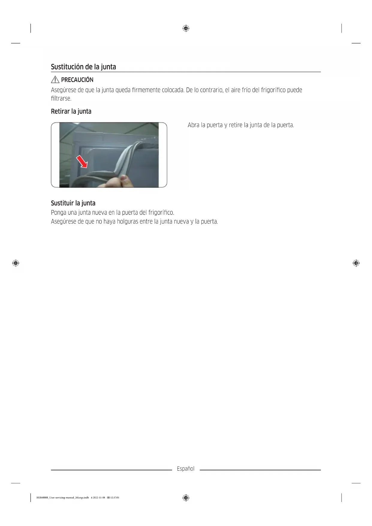 01 Panel principal 02 Estante 03 Cajón (normal/grande) 04 Etiqueta de código de barras BRR6000B_User-servicing-manual_26langs.indb 3 2022-11-08 12:37:00Español Sustitución de la junta PRECAUCIÓN Asegúrese de que la junta queda rmemente colocada. De lo contrario, el aire frío del frigoríco puede ltrarse. Retirar la junta Abra la puerta y retire la junta de la puerta. Sustituir la junta Ponga una junta nueva en la puerta del frigoríco. Asegúrese de que no haya holguras entre la junta nueva y la puerta. BRR6000B_User-servicing-manual_26langs.indb 4 2022-11-08 12:37:01Español Sustitución del cajón PRECAUCIÓN Compruebe que el cajón queda insertado correctamente en el riel durante el montaje. Retirar el cajón Levante con cuidado la parte frontal del cajón y deslícelo hacia afuera. Volver a colocar los cajones La colocación de los cajones sigue el orden inverso al de sus respectivos pasos de extracción. Sustitución de la bisagra Para sustituir las bisagras debe quitar primero las puertas. ADVERTENCIA