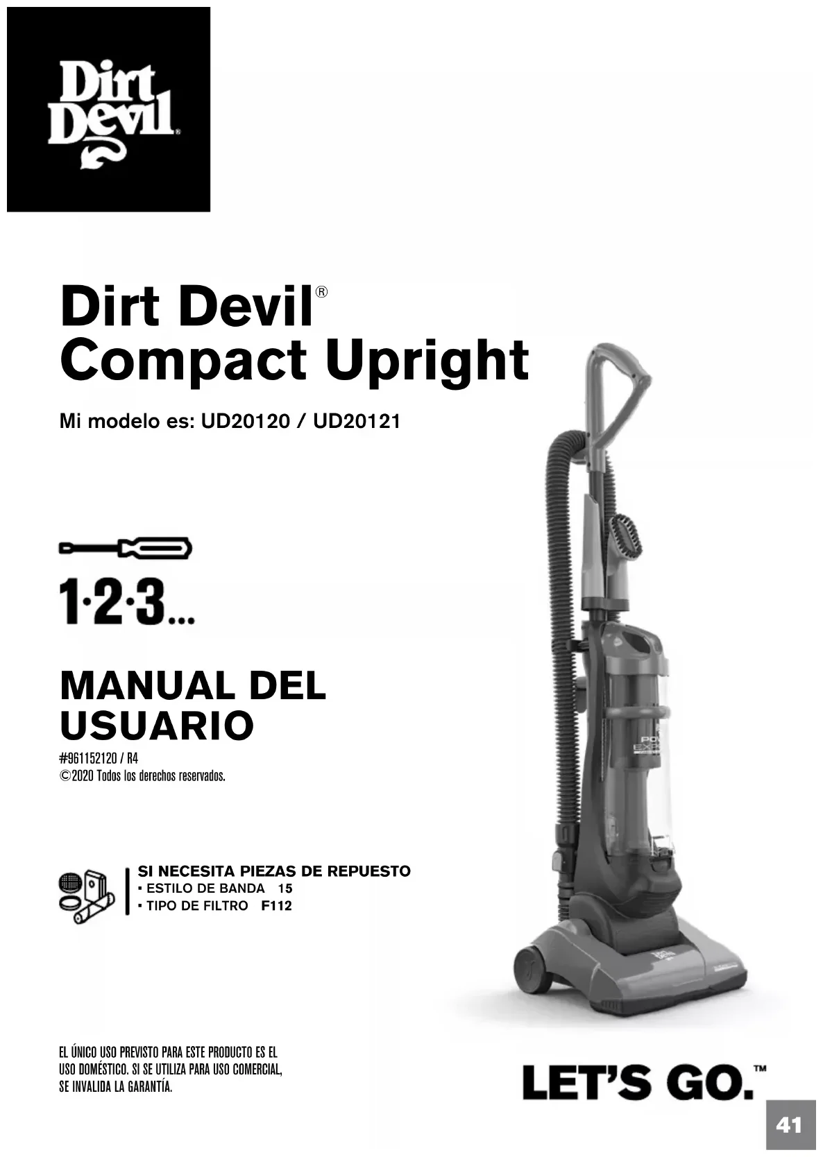 Compact Upright Mi modelo es: UD20120 / UD20121 MANUAL DEL USUARIO #961152120 / R4©2020 Todos los derechos reservados.SI NECESITA PIEZAS DE REPUESTO• ESTILO DE BANDA 15• TIPO DE FILTRO F112EL ÚNICO USO PREVISTO PARA ESTE PRODUCTO ES EL USO DOMÉSTICO. SI SE UTILIZA PARA USO COMERCIAL, SE INVALIDA LA GARANTÍA.42 HOLA. BIENVENIDO. REGISTRO DEL PRODUCTO Para poder consultar rápidamente, anote la información de su producto a continuación. N. ° de modelo: Cód. de fabricación: (El cód. de fabricación ubicado en el reverso del producto o en su base.) Registro de la garantía Asegúrese de registrar su producto en línea, en el sitio www. DirtDevil.com, o comuníquese al 1-800-321-1134 para realizar el registro telefónicamente. Consejo: Adjunte su recibo de compra a este Manual del propietario. Puede que le soliciten la fecha de compra para obtener el servicio de la garantía de su producto Dirt Devil