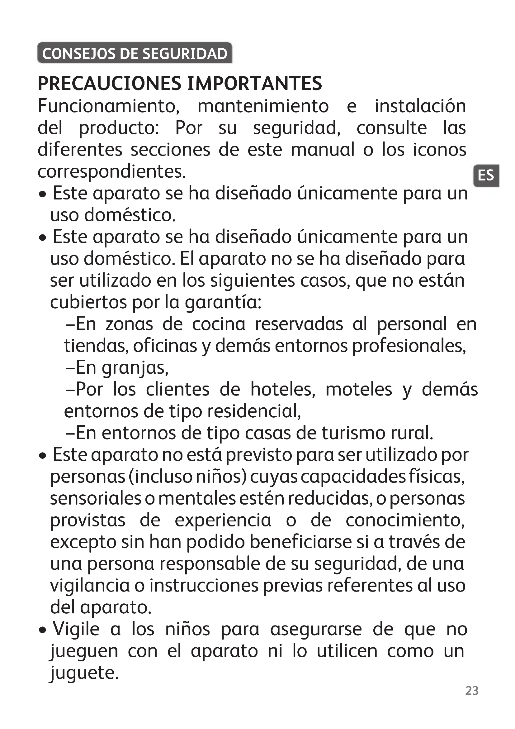 - Este aparato se ha diseñado únicamente para un uso doméstico. El aparato no se ha diseñado para ser utilizado en los siguientes casos, que no están cubiertos por la garantía: – En zonas de cocina reservadas al personal en tiendas, oficinas y demás entornos profesionales, – En granjas, – Por los clientes de hoteles, moteles y demás entornos de tipo residencial, – En entornos de tipo casas de turismo rural.