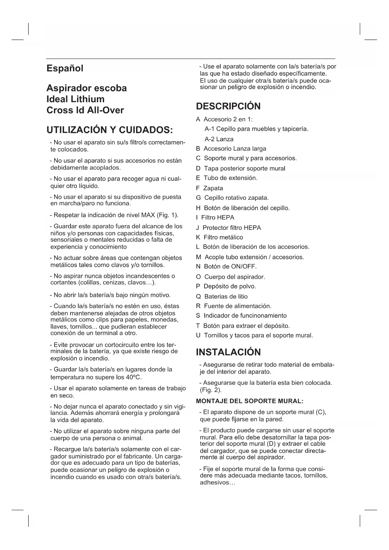 GG HFig.2Fig.1 Fig.3 Fig.4Fig.5 Fig.6 Fig.7 Fig.8 Fig.9 Fig.10 Fig.11Español Aspirador escoba Ideal Lithium Cross Id All-Over UTILIZACIÓN Y CUIDADOS: - No usar el aparato sin su/s ltro/s correctamen- te colocados. - No usar el aparato si sus accesorios no están debidamente acoplados. - No usar el aparato para recoger agua ni cual- quier otro líquido. - No usar el aparato si su dispositivo de puesta en marcha/paro no funciona. - Respetar la indicación de nivel MAX (Fig. 1). - Guardar este aparato fuera del alcance de los niños y/o personas con capacidades físicas, sensoriales o mentales reducidas o falta de experiencia y conocimiento - No actuar sobre áreas que contengan objetos metálicos tales como clavos y/o tornillos. - No aspirar nunca objetos incandescentes o cortantes (colillas, cenizas, clavos…). - No abrir la/s batería/s bajo ningún motivo. - Cuando la/s batería/s no estén en uso, éstas deben mantenerse alejadas de otros objetos metálicos como clips para papeles, monedas, llaves, tornillos... que pudieran establecer conexión de un terminal a otro. - Evite provocar un cortocircuito entre los ter- minales de la batería, ya que existe riesgo de explosión o incendio. - Guardar la/s batería/s en lugares donde la temperatura no supere los 40ºC. - Usar el aparato solamente en tareas de trabajo en seco. - No dejar nunca el aparato conectado y sin vigi- lancia. Además ahorrará energía y prolongará la vida del aparato. - No utilizar el aparato sobre ninguna parte del cuerpo de una persona o animal. - Recargue la/s batería/s solamente con el car- gador suministrado por el fabricante. Un carga- dor que es adecuado para un tipo de baterías, puede ocasionar un peligro de explosión o incendio cuando es usado con otra/s batería/s. - Use el aparato solamente con la/s batería/s por las que ha estado diseñado especícamente. El uso de cualquier otra/s batería/s puede oca- sionar un peligro de explosión o incendio. DESCRIPCIÓN A Accesorio 2 en 1: A-1 Cepillo para muebles y tapicería. A-2 Lanza B Accesorio Lanza larga C Soporte mural y para accesorios. D Tapa posterior soporte mural E Tubo de extensión. F Zapata G Cepillo rotativo zapata. H Botón de liberación del cepillo. I Filtro HEPA J Protector ltro HEPA K Filtro metálico L Botón de liberación de los accesorios. M Acople tubo extensión / accesorios. N Botón de ON/OFF. O Cuerpo del aspirador. P Depósito de polvo. Q Baterias de litio R Fuente de alimentación. S Indicador de funcinonamiento T Botón para extraer el depósito. U Tornillos y tacos para el soporte mural. INSTALACIÓN - Asegurarse de retirar todo material de embala- je del interior del aparato. - Asegurarse que la batería esta bien colocada. (Fig. 2). MONTAJE DEL SOPORTE MURAL: - El aparato dispone de un soporte mural (C), que puede jarse en la pared. - El producto puede cargarse sin usar el soporte mural. Para ello debe desatornillar la tapa pos- terior del soporte mural (D) y extraer el cable del cargador, que se puede conectar directa- mente al cuerpo del aspirador. - Fije el soporte mural de la forma que consi- dere más adecuada mediante tacos, tornillos, adhesivos…- Asegurarse que el soporte esté anclado de forma que sea capaz de aguantar al menos el doble del peso del aparato. - Encajar el aparato en su soporte mural.