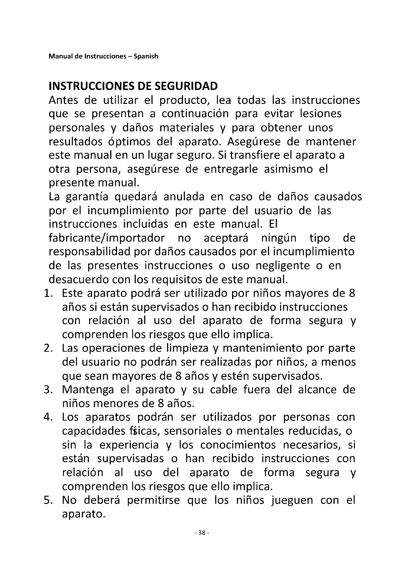 Antes de utilizar el producto, lea todas las instrucciones que se presentan a continuación para evitar lesiones personales y daños materiales y para obtener unos resultados óptimos del aparato. Asegúrese de mantener este manual en un lugar seguro. Si transfiere el aparato a otra persona, asegúrese de entregarle asimismo el presente manual. La garantía quedará anulada en caso de daños causados por el incumplimiento por parte del usuario de las instrucciones incluidas en este manual. El fabricante/importador no aceptará ningún tipo de responsabilidad por daños causados por el incumplimiento de las presentes instrucciones o uso negligente o en desacuerdo con los requisitos de este manual.
