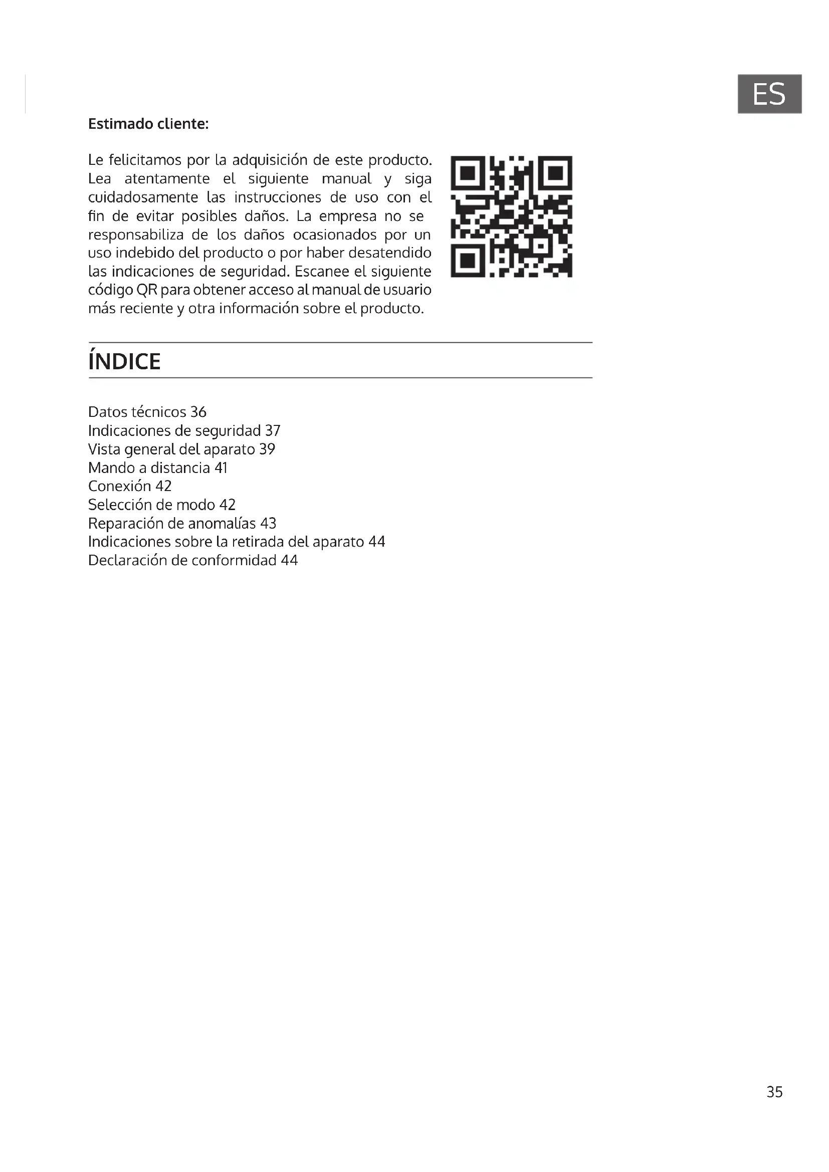 Estimado cliente: Le felicitamos por la adquisición de este producto. Lea atentamente el siguiente manual y siga cuidadosamente las instrucciones de uso con el n de evitar posibles daños. La empresa no se responsabiliza de los daños ocasionados por un uso indebido del producto o por haber desatendido las indicaciones de seguridad. Escanee el siguiente código QR para obtener acceso al manual de usuario más reciente y otra información sobre el producto. ÍNDICE Datos técnicos 36 Indicaciones de seguridad 37 Vista general del aparato 39 Mando a distancia 41 Conexión 42 Selección de modo 42 Reparación de anomalías 43 Indicaciones sobre la retirada del aparato 44 Declaración de conformidad 4436